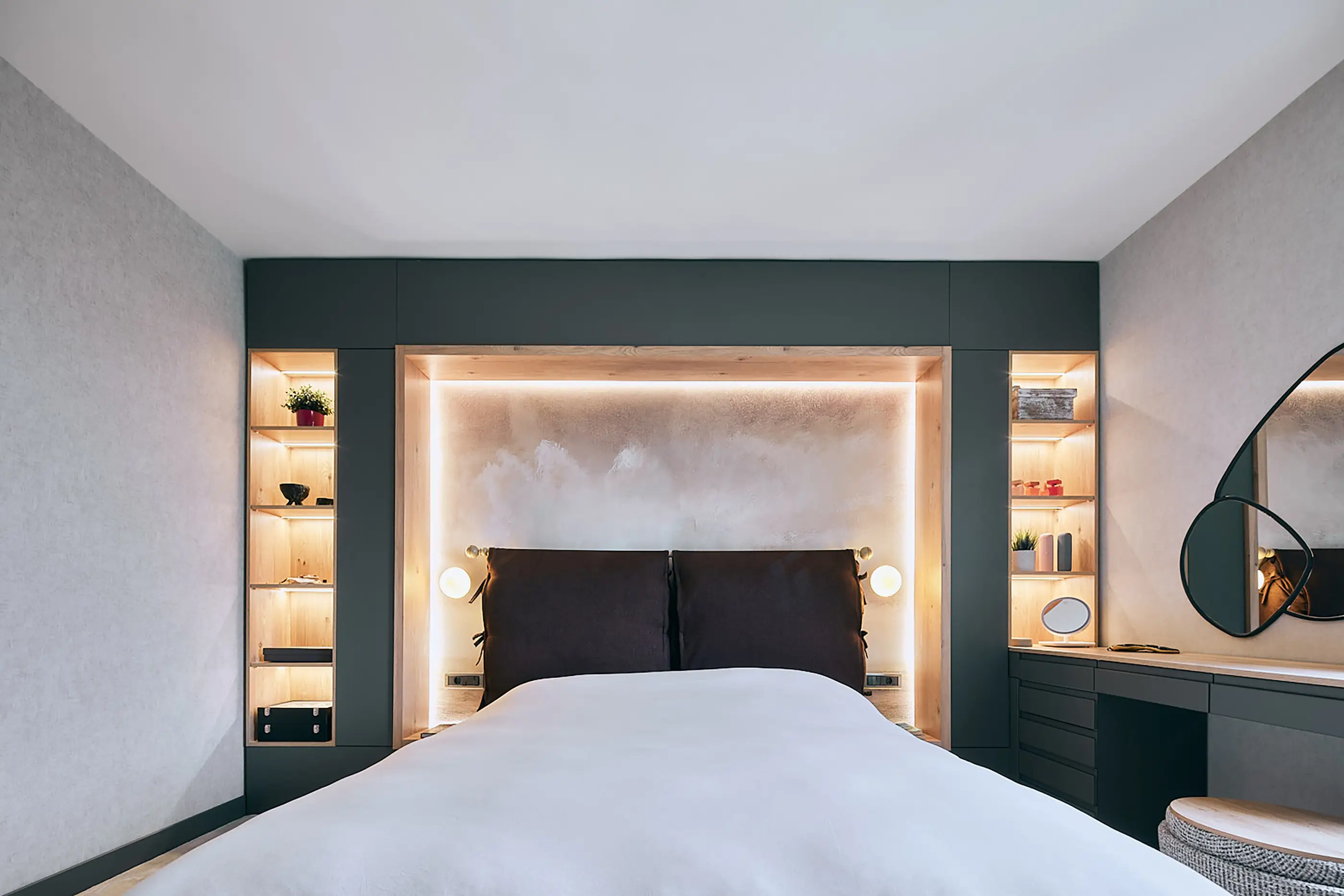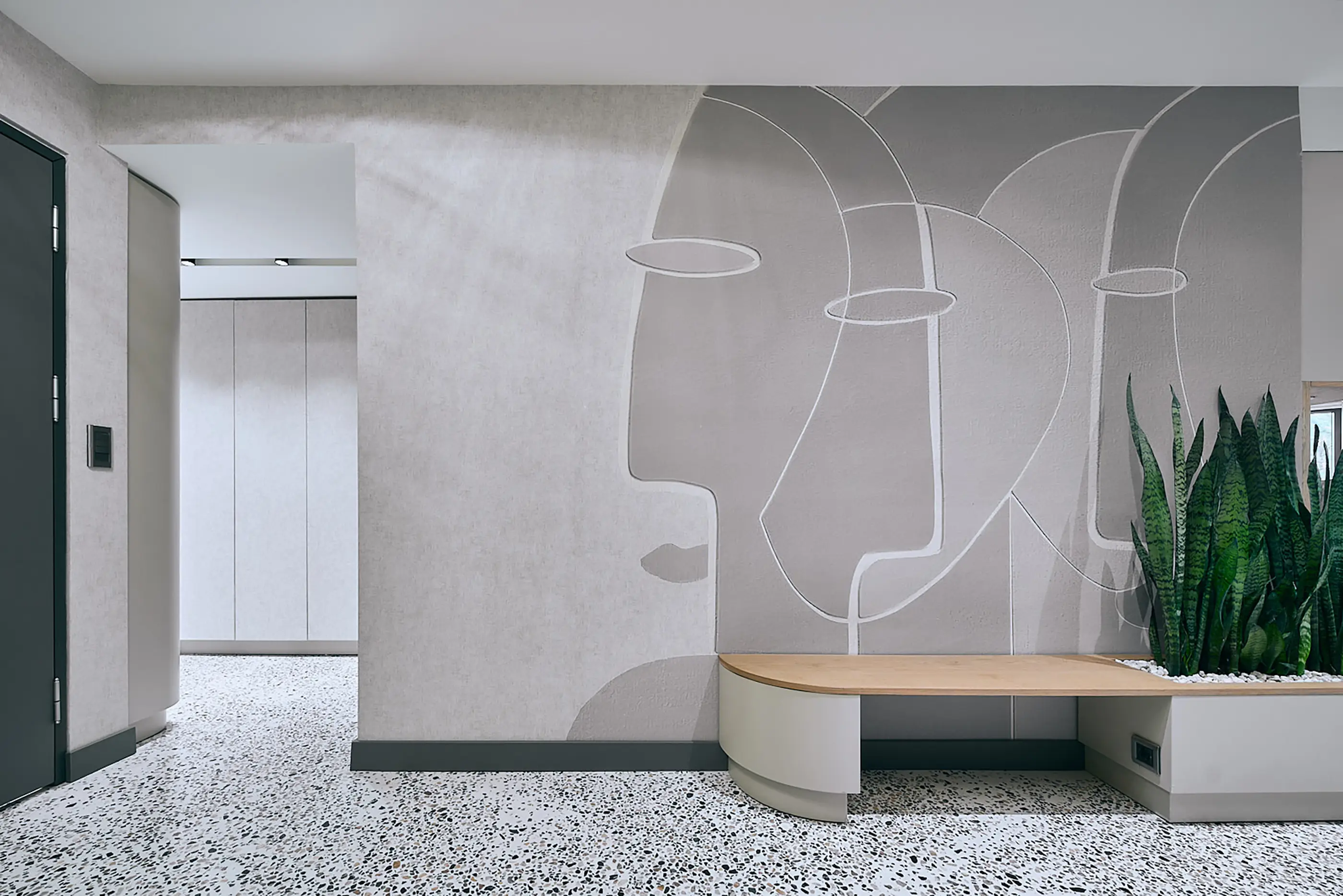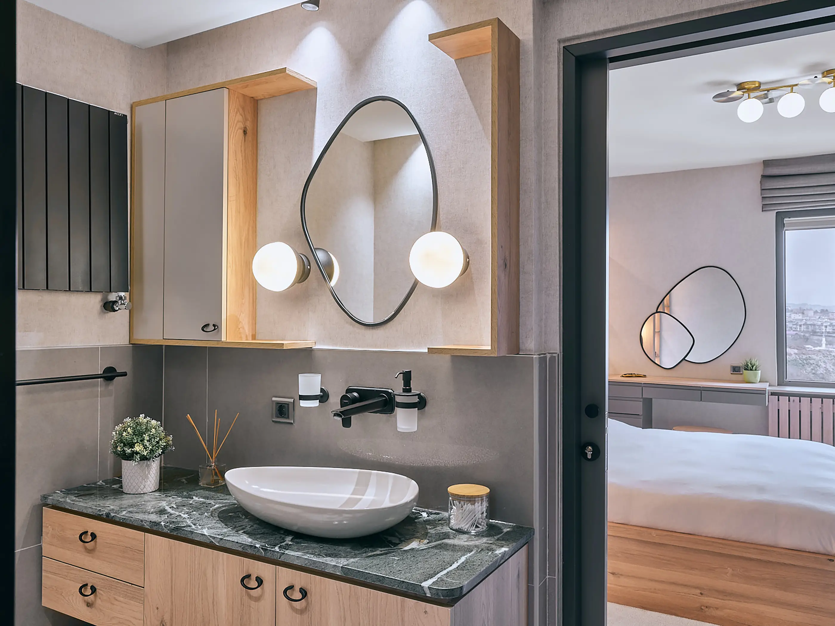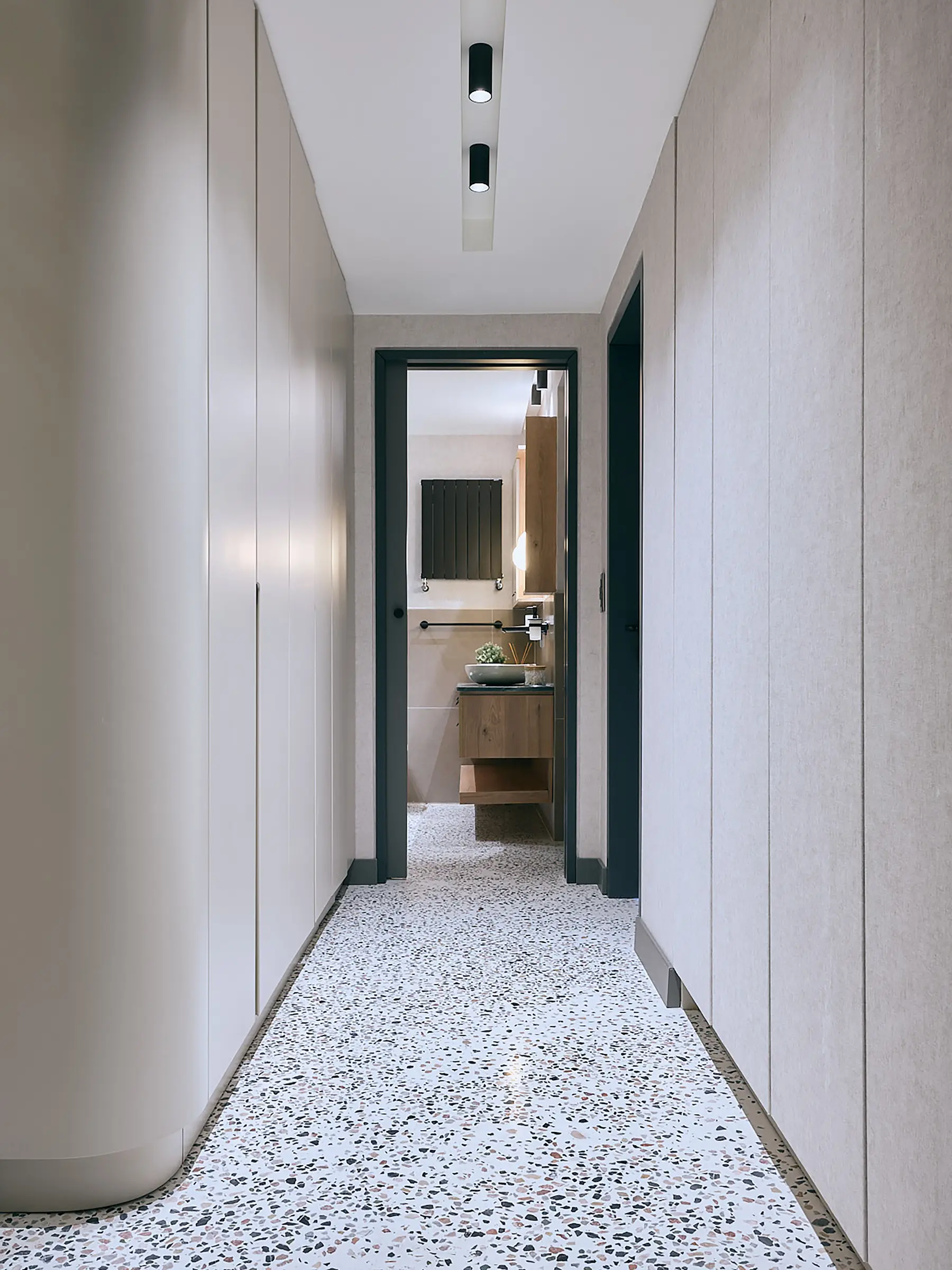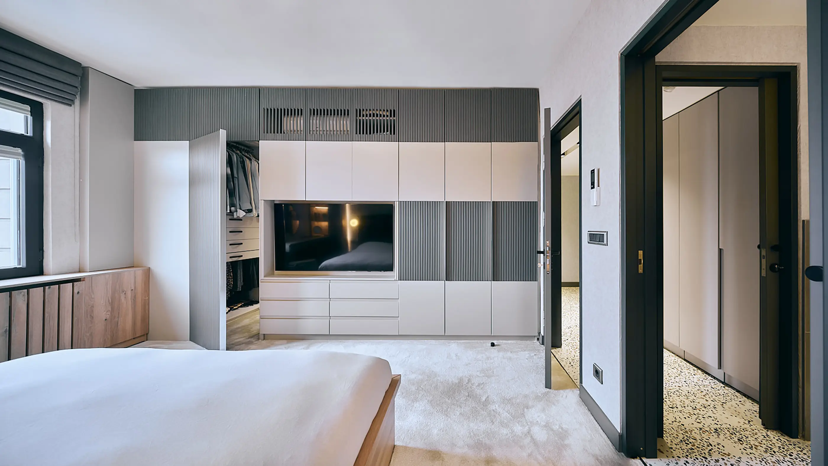 The walls in circulation areas were converted into storage spaces to meet the user's needs. In spacious areas, these storage spaces were designed as integrated furniture pieces connecting different areas, while in narrow spaces, they were continued in the same tone as the wall texture. The TV unit in the entrance hall transforms into a potted cedar, and the kitchen cabinets double as a hallstand. The narrow night hall is refreshed by continuing the earthy tones of the terrazzo and the wallpaper used on all walls in the furniture. The existing bathroom layout was rearranged, and a new entrance was created from the bedroom, saving space for a new bathroom. The bedroom maintains fidelity to the color palette. The storage unit, which incorporates a TV and air conditioning, opens into the dressing room. The soft-textured carpet chosen under the bed is also continued in the dressing room.