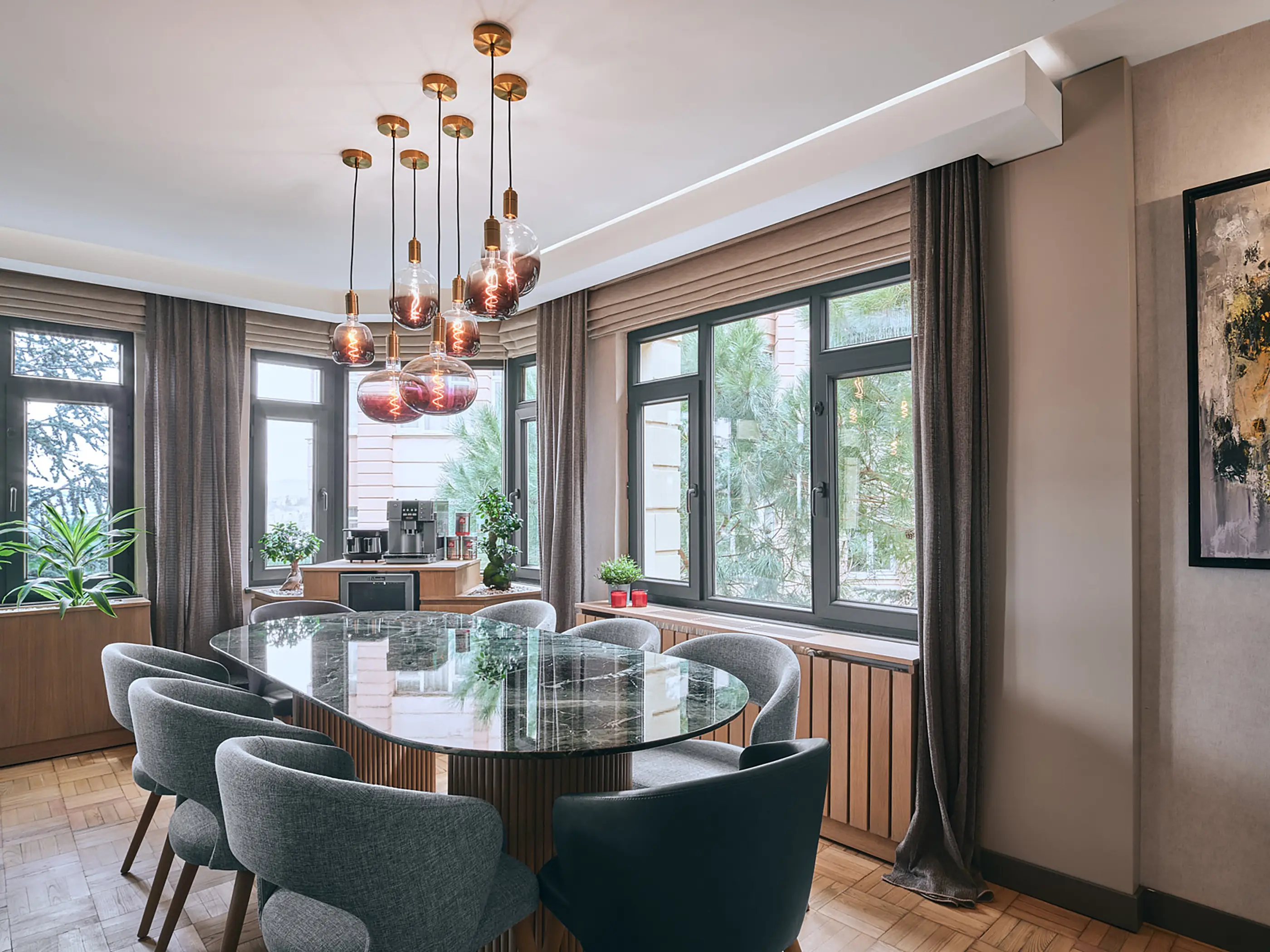 Terrazzo, extending from the entrance hall towards the kitchen and bathroom, serves as the unifying material of the house and defines the circulation. The stones in the terrazzo are in earthy tones, setting the color palette for the entire house. The green color in the kitchen furniture and the oak wood tone were inspired by these stones. The old and valuable parquet flooring in the living room was individually removed, restored in a workshop, and then reinstalled to align with the new floor levels of the house. The contrast between the old parquet and the new terrazzo became one of the important design features of the house. Several trials were conducted to ensure the harmony of different shades of oak wood used in the house.
