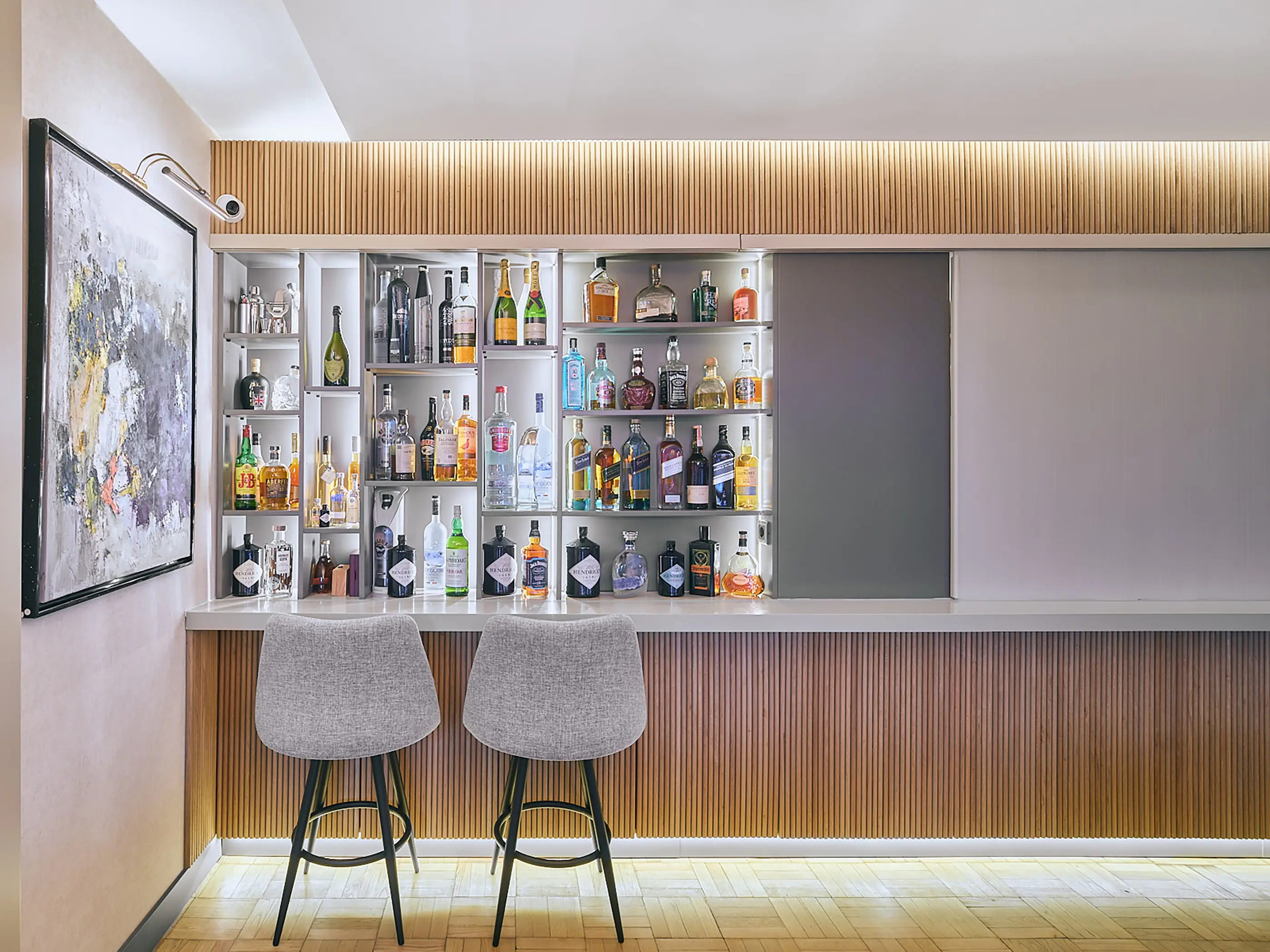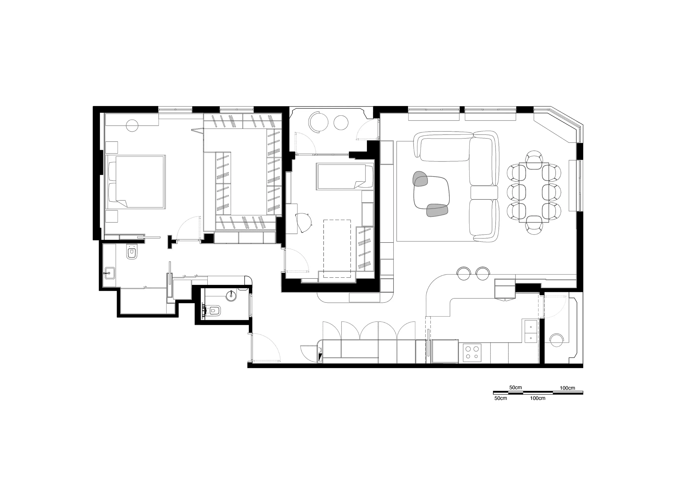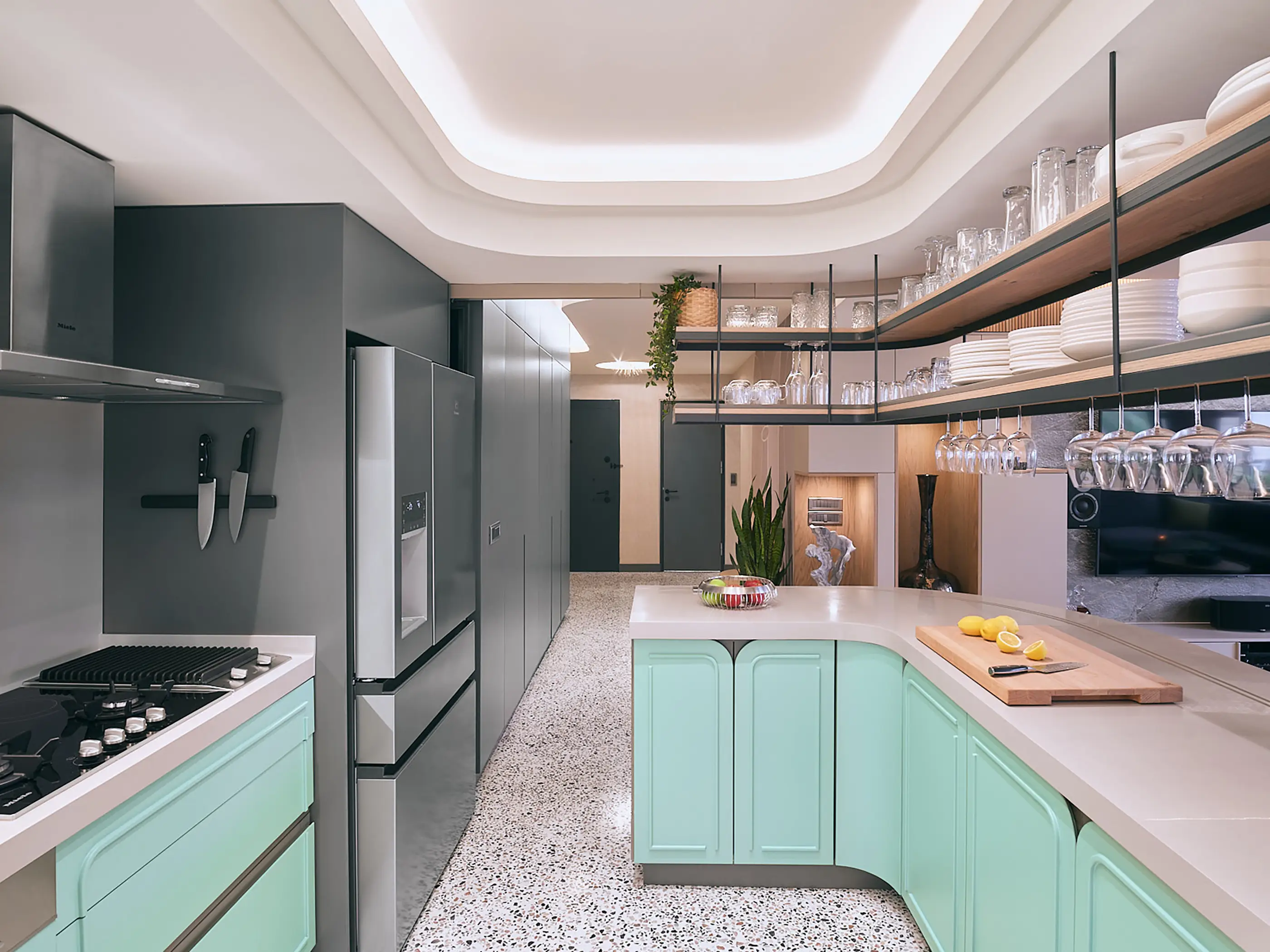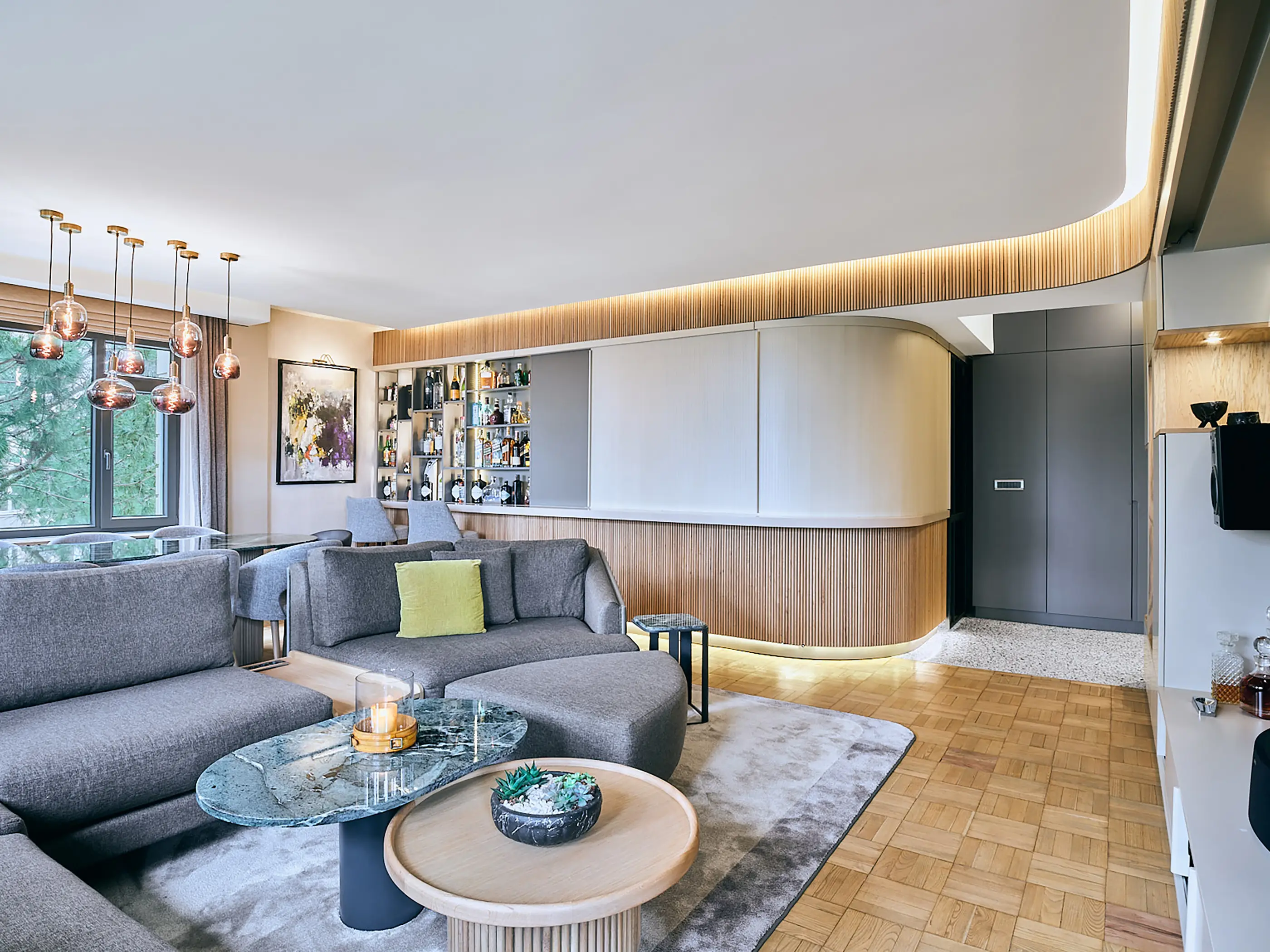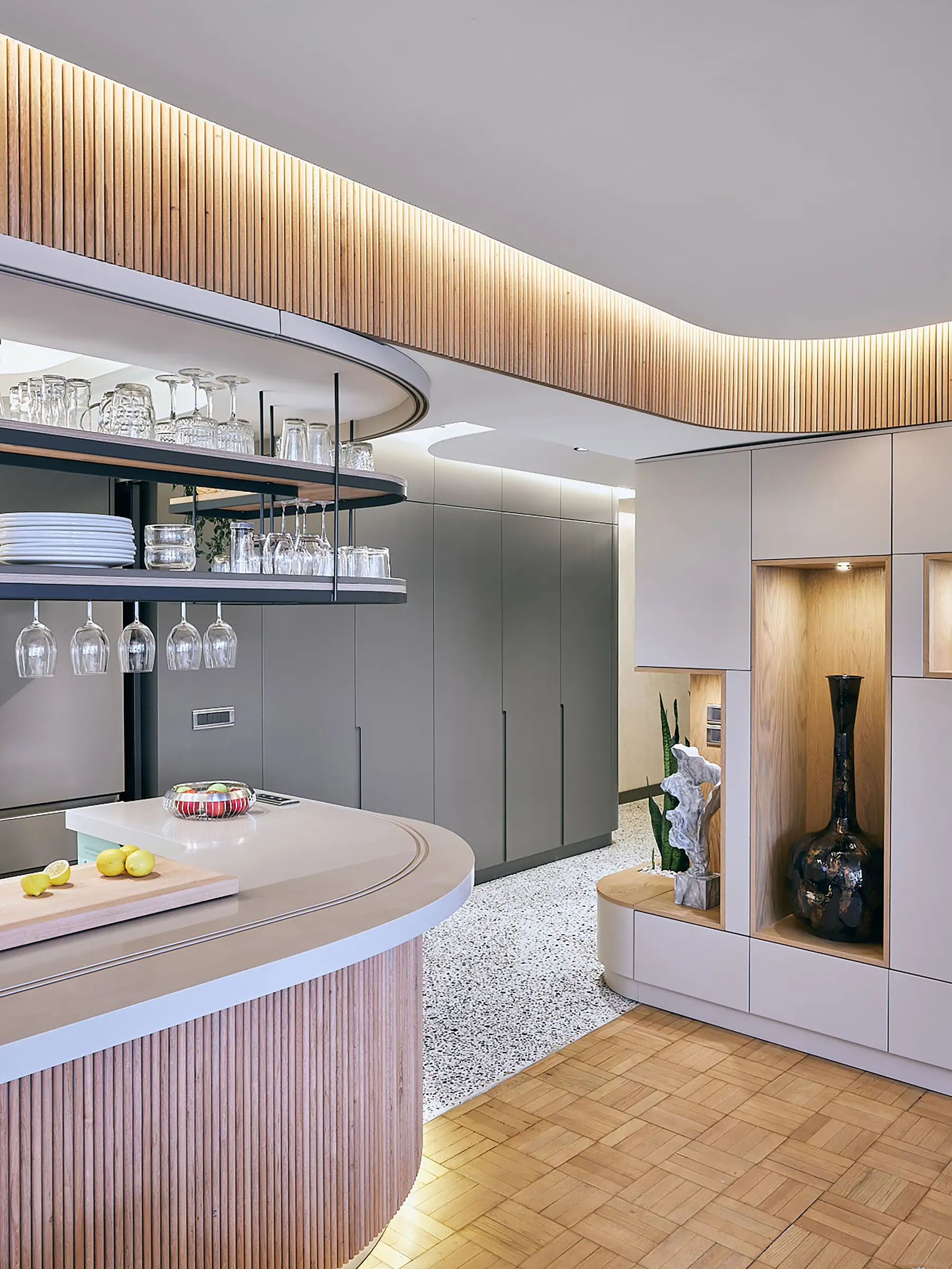 The aim of the project was to create efficient and fluid spaces from small square meters, using natural and innovative materials. The initial decision to transform the apartment, which had outdated details and a dark hallway, was to open up the kitchen, living room, and entrance area by removing the walls that separated them. This decision not only increased the sense of spaciousness but also meant sacrificing the comfort of a closed kitchen. In this context, a movable wooden panel integrated with the kitchen island was designed to provide the user with the option to connect or separate spaces. This panel can move along the curved kitchen island border, thanks to flexible fabric between specially sized wooden slats. When the panel is closed, the kitchen becomes private, and the bar is open; when the panel is open, the spaces integrate, and the bar is closed.
