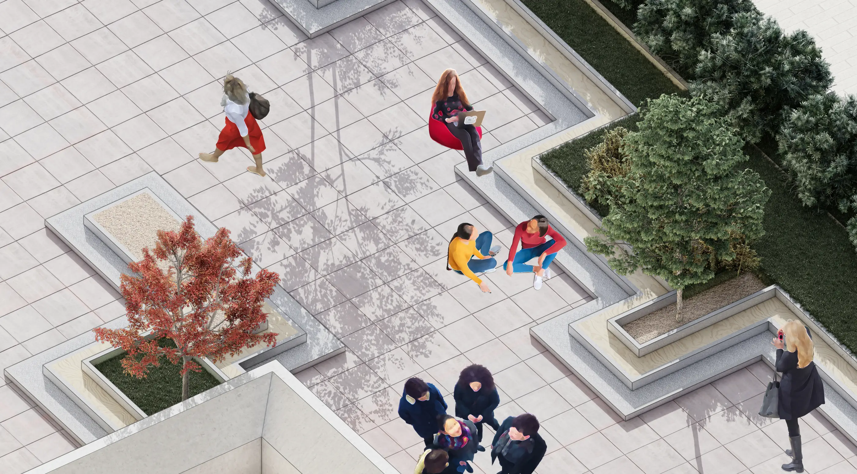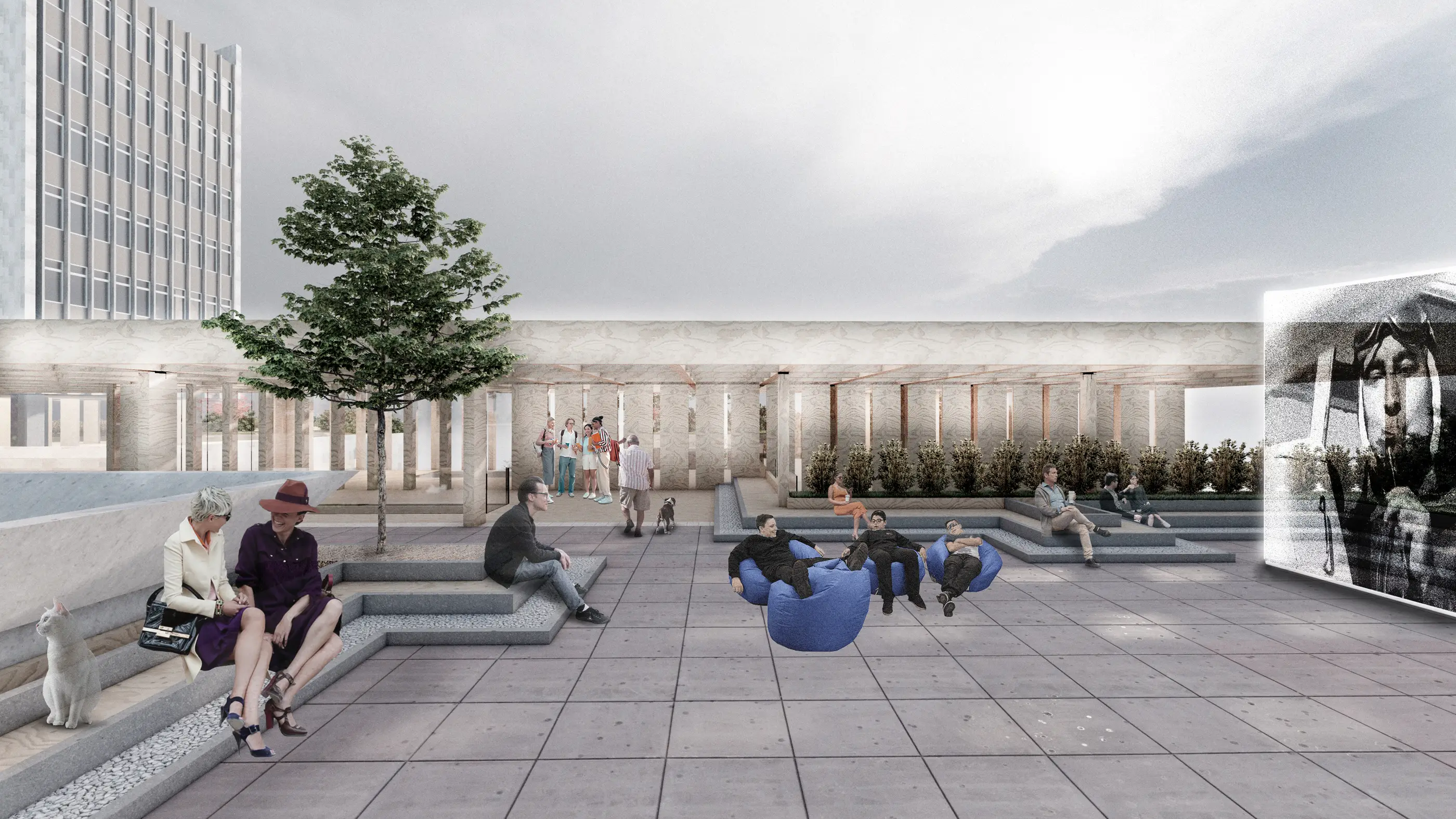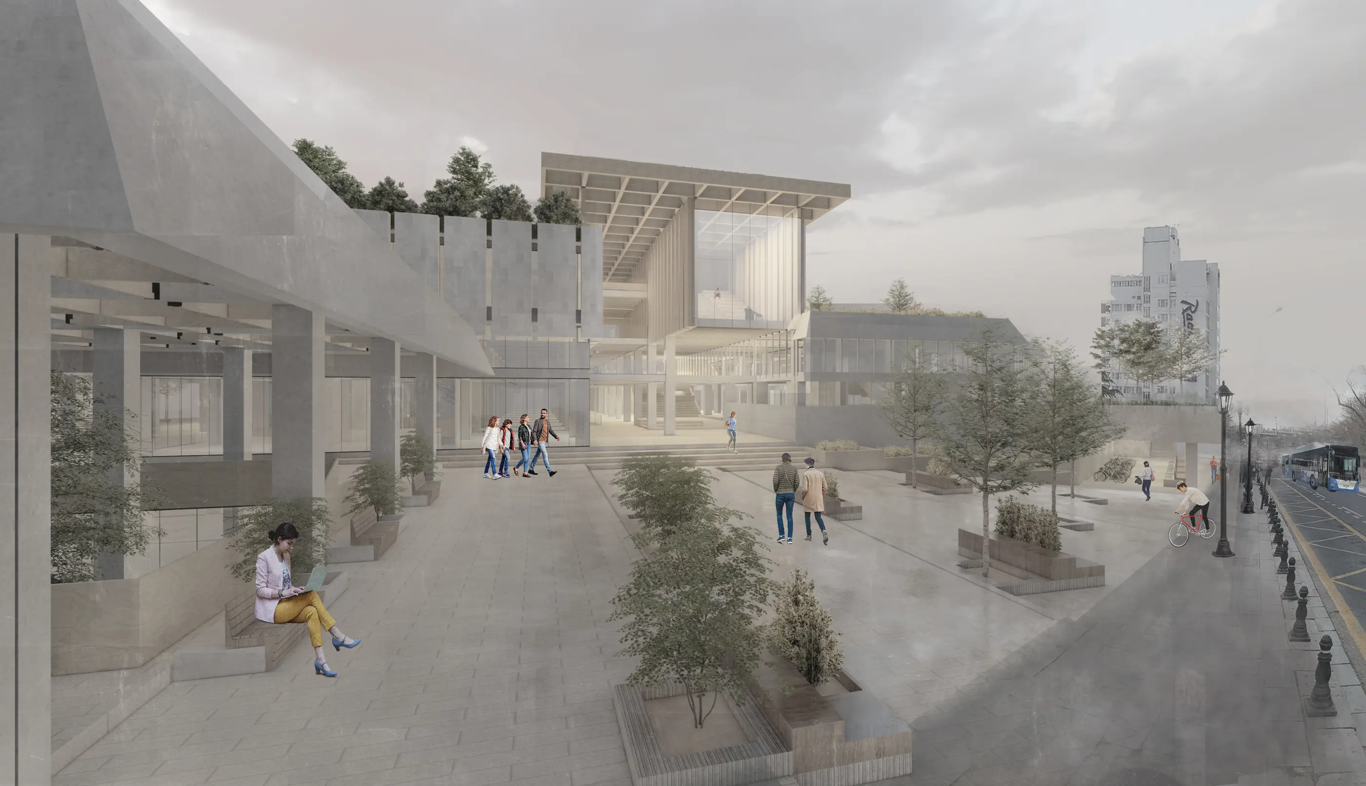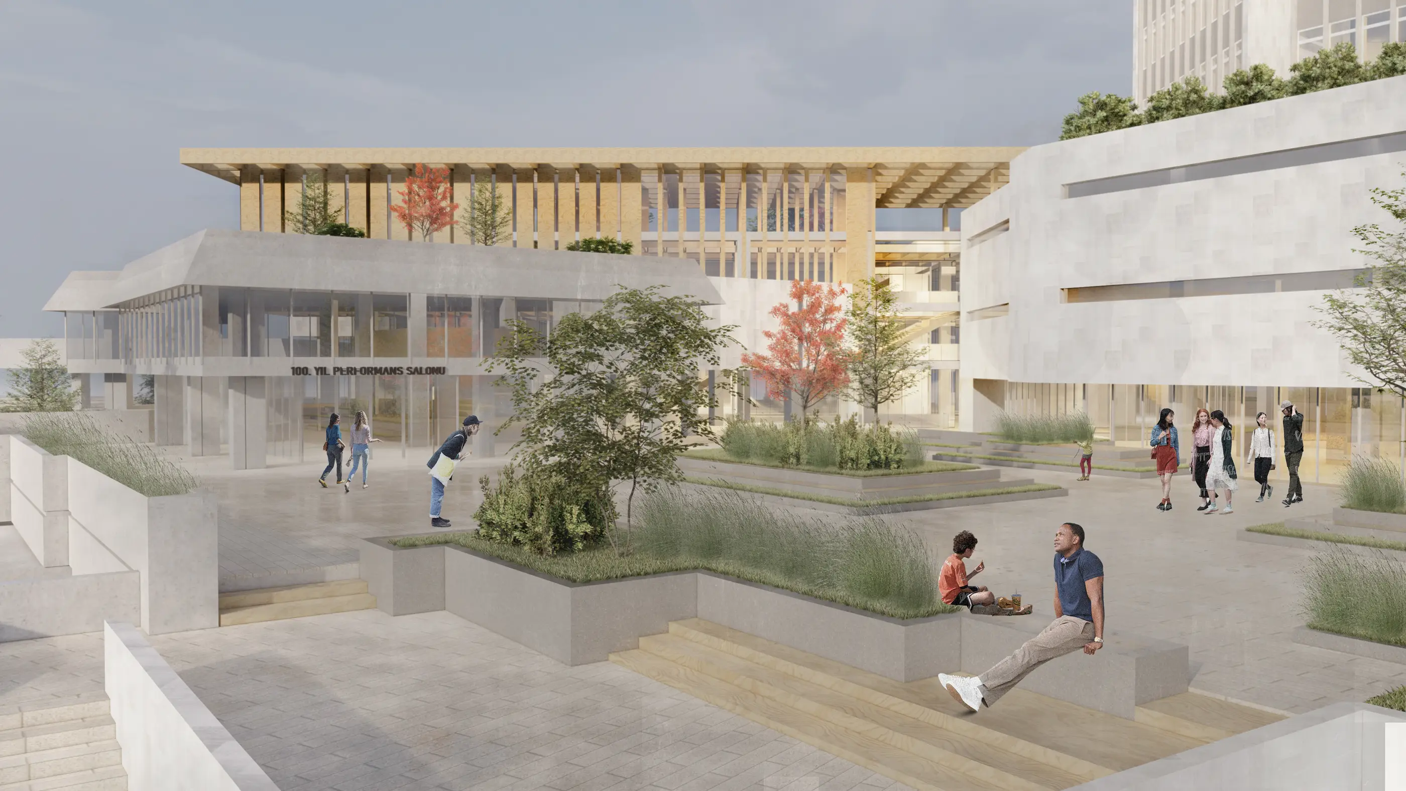 Yapının terasları proje kapsamında yeniden ele alınarak kamusal kullanımın bir parçası hâline getirilmiştir. Üst kotta yer alan teras, ofis boşluğuyla ilişkili herkese açık çalışma alanları ve alternatif sahneye geçiş sağlayan bir yeşil alan olarak düzenlenmiştir. Ofis bloğunda bulunan ticaret işlevleri iptal edilerek iki katlı bir kütüphaneye dönüştürülmüş ve ahşap yapıdan giriş verilen kütüphane teraslarla ilişkilendirilmiştir. Sinema fuayesinin yeniden kurgulanmasıyla alt kotta açık hava gösterilerine imkân veren yeni bir kamusal teras tanımlanmıştır.