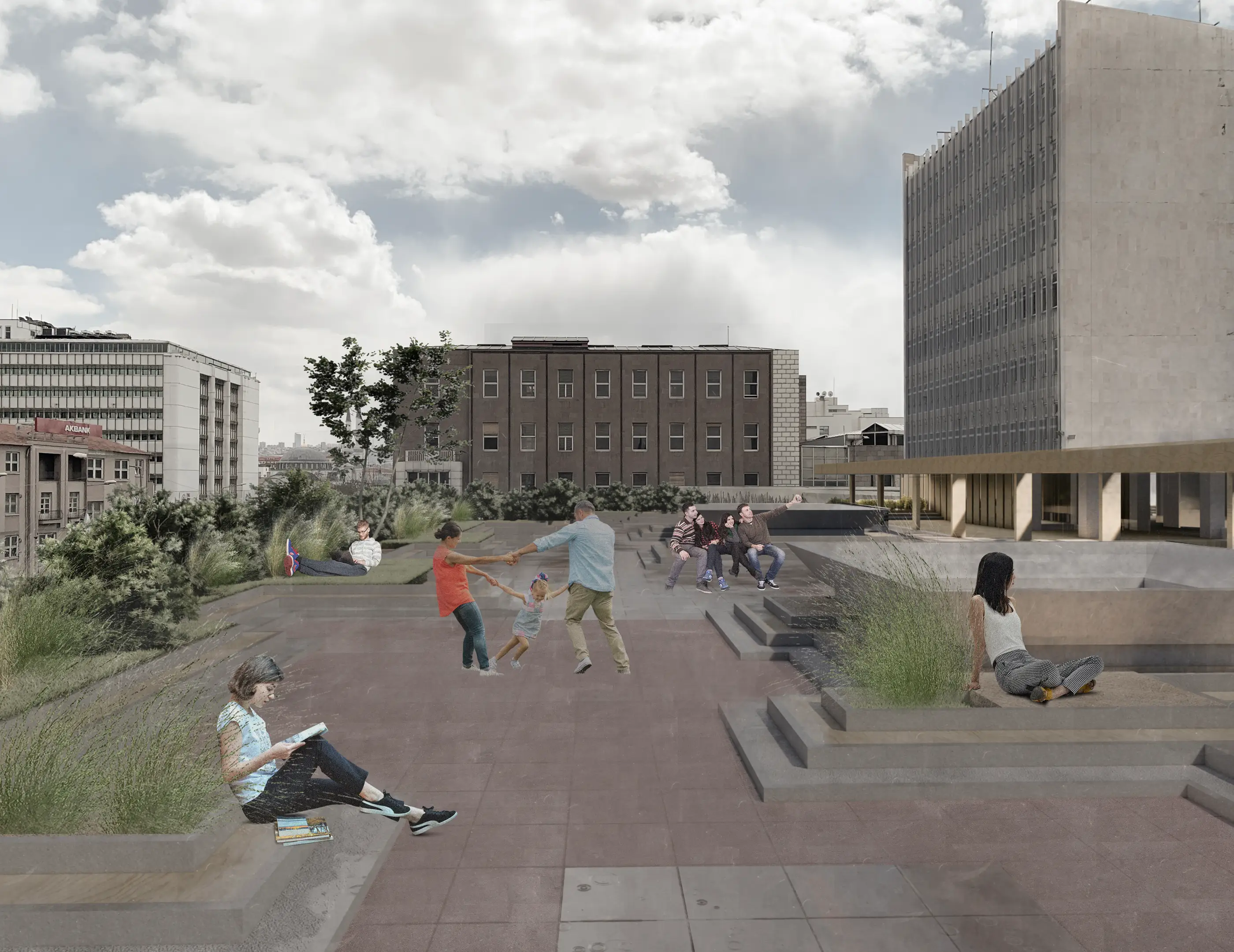 Ulus Meydanı’na cephe veren tek katlı kütlenin karakteristik saçağı ve strüktürü korunmuş; Ulus Meydanı’ndan Gençlik Parkı’na inen aksın sürekliliğini sağlamak amacıyla bu kütlenin cephesi kaldırılarak çarşıya giriş veren bir avlu oluşturulmuştur. Atatürk Bulvarı ve Cumhuriyet Caddesi boyunca yeniden düzenlenen peyzaj, meydan, sokak ve yapı arasındaki ilişkiyi güçlendiren akışkan bir kamusal zemin üretir.