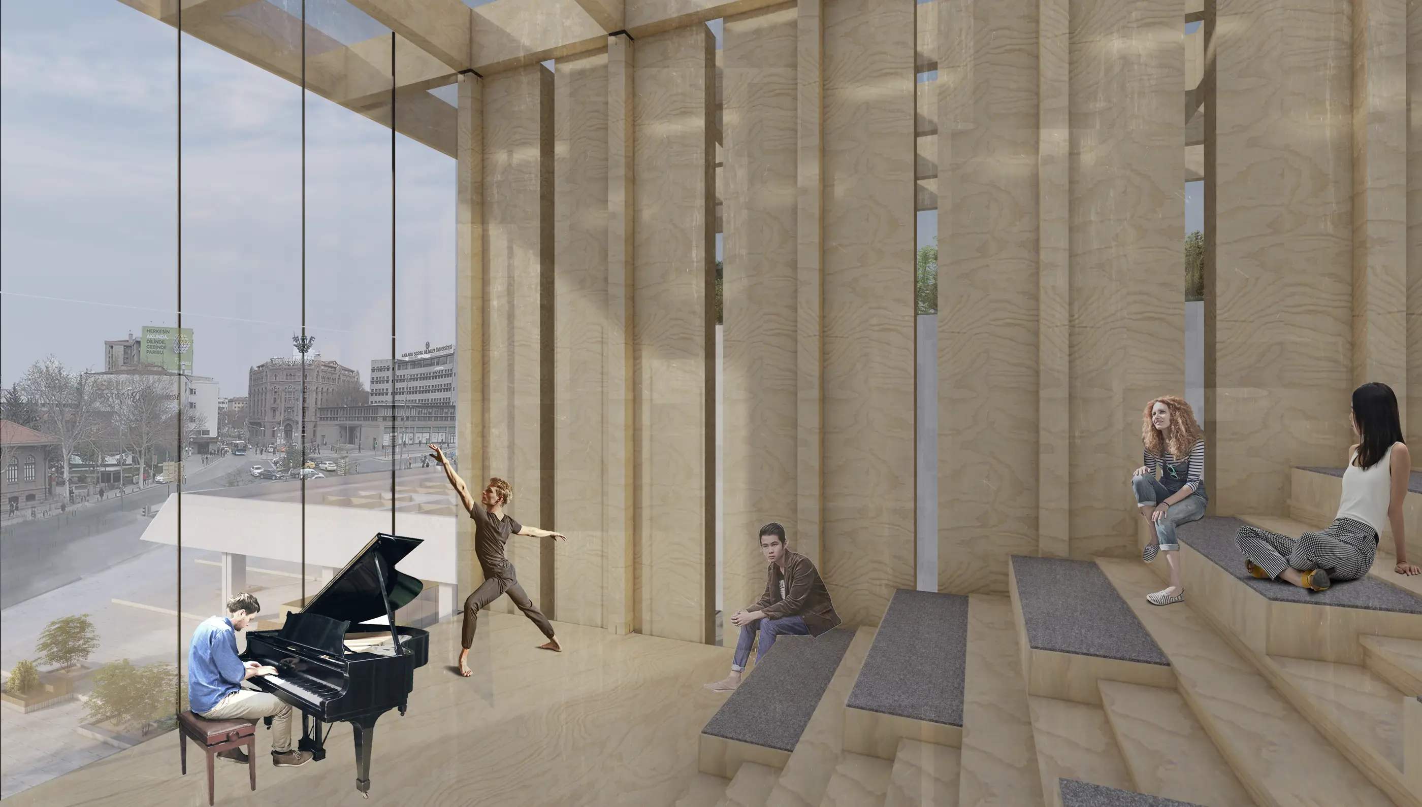 Bu boşluğa yalnızca yapısal lamine ahşap kullanılarak yeni düzlemler eklenmiştir. Mevcut yapıya eklemlenen bu ahşap strüktür, ticaret, ofis, sinema ve sanat galerisi gibi farklı işlevler arasında bağlantılar kurarken, bazı noktalarda yeni mekânsal tanımlar üretir. Cumhuriyet’in kuruluşunun simgesi olan TBMM’yi karşısına alan alternatif sahne kütlesi, oluşturulan kamusal boşluğun işareti olarak Cumhuriyet Caddesi’ne uzanmaktadır.