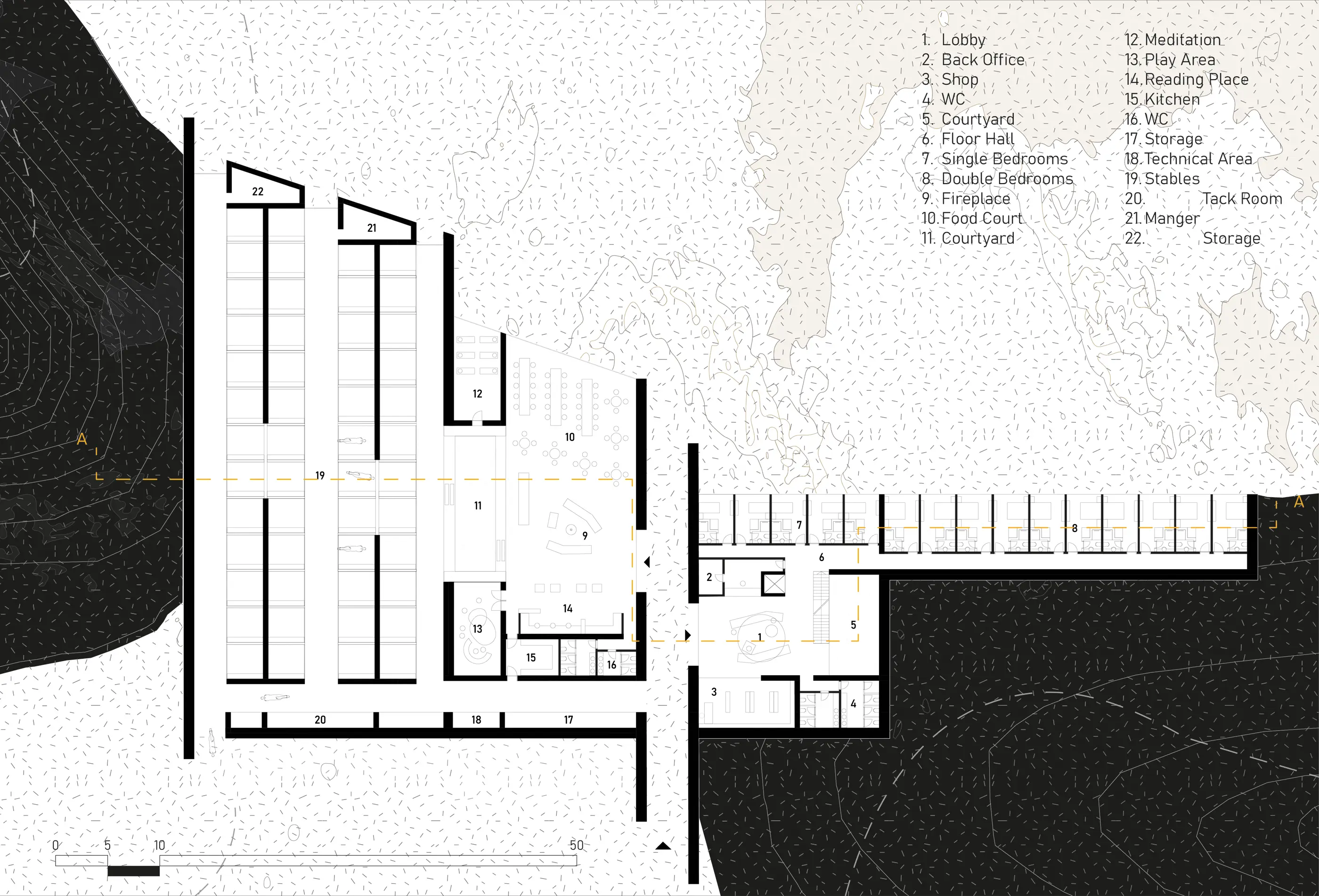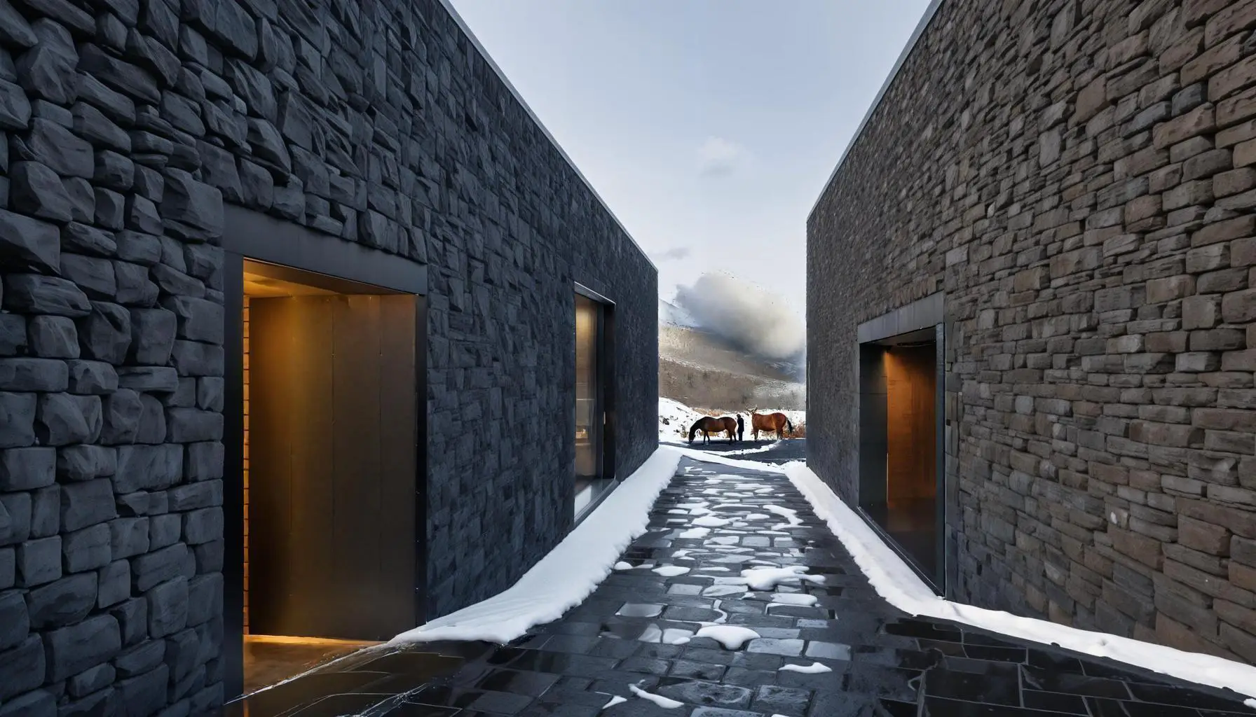 The accommodation and stable units are seamlessly integrated into the topography of the site. The load-bearing walls made from volcanic stones not only highlight the use of local materials but also emphasize the strong relationship we've established with the surrounding context. Just as we create structures from the stones we excavate from the earth, one day we can dismantle the building and allow it to return to nature. By incorporating this cyclical principle, we aim to create structures that coexist harmoniously with the environment through their entire life cycle.