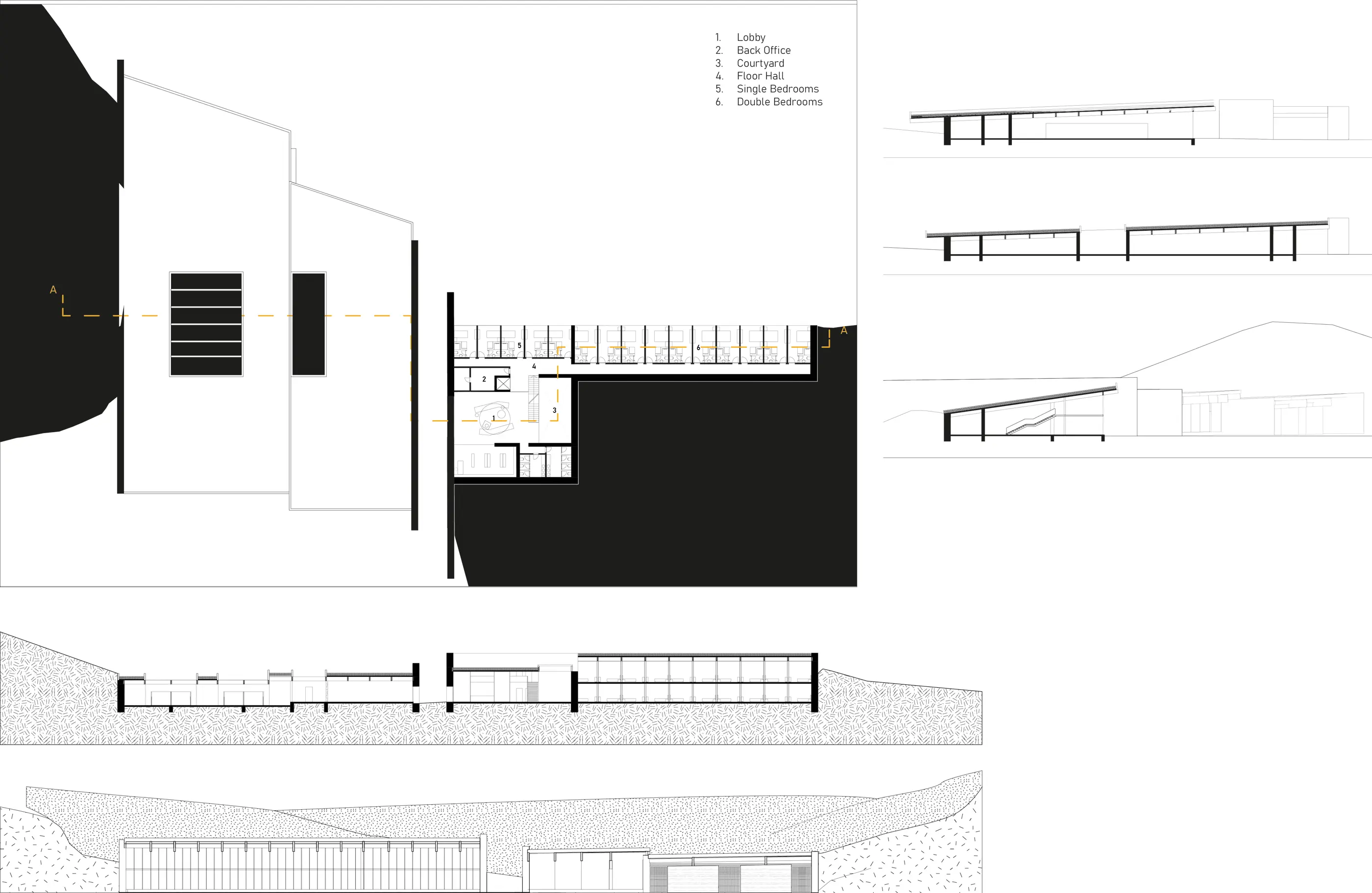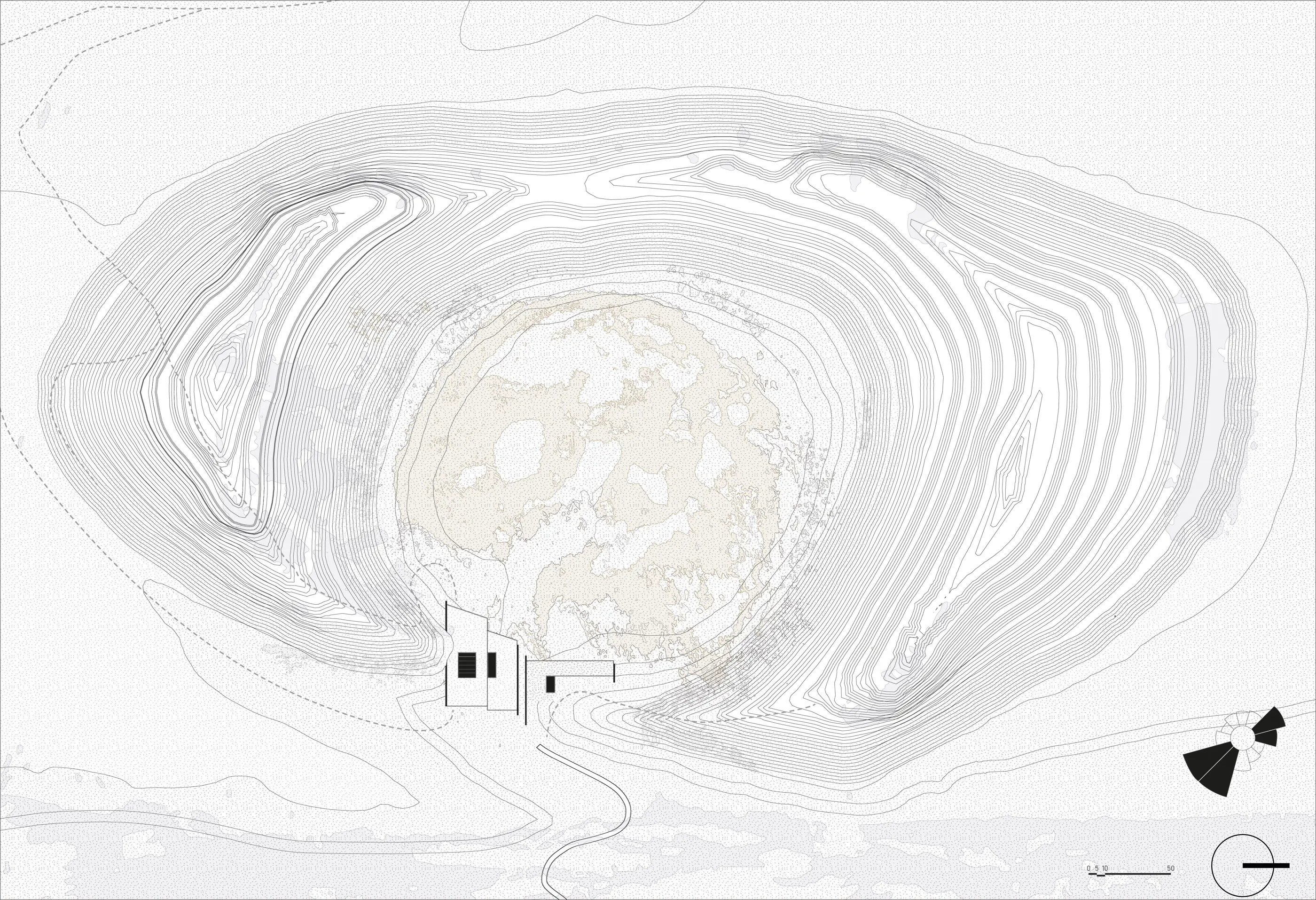 When designing the spatial hierarchy, we aimed to create fluid relationships between open and closed areas. The key concept, the "gap", creates an open connection between the crater, the accommodation units, and communal areas, ensuring the preservation of the crater's public nature. The sunken communal spaces, with courtyards opening between them, enhance the visual connection between spaces while strengthening their relationship with daylight.