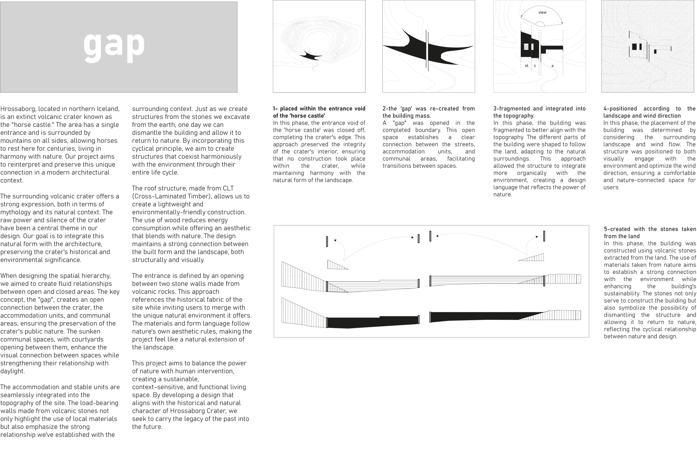 This project aims to balance the power of nature with human intervention, creating a sustainable, context-sensitive, and functional living space. By developing a design that aligns with the historical and natural character of Hrossaborg Crater, we seek to carry the legacy of the past into the future.