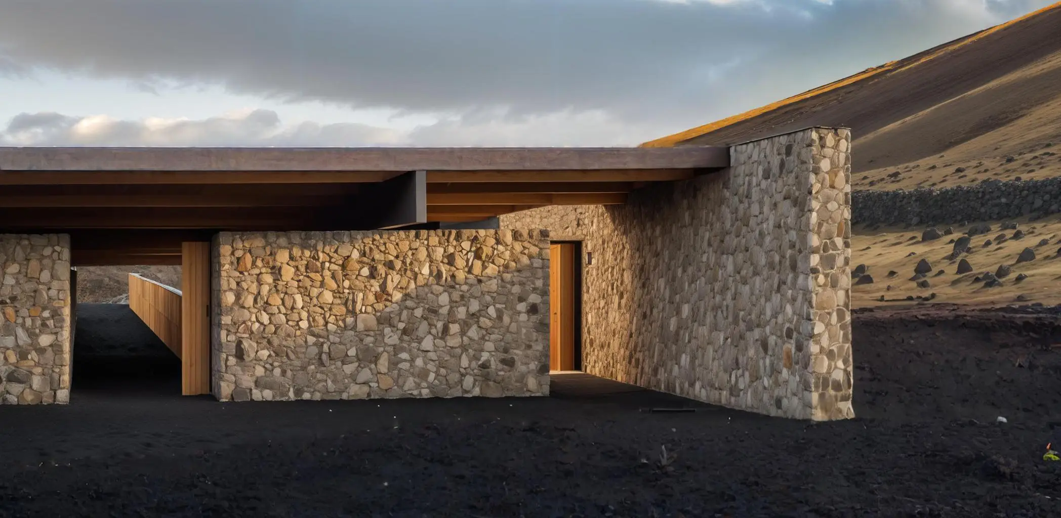 The entrance is defined by an opening between two stone walls made from volcanic rocks. This approach references the historical fabric of the site while inviting users to merge with the unique natural environment it offers. The materials and form language follow nature's own aesthetic rules, making the project feel like a natural extension of the landscape.
