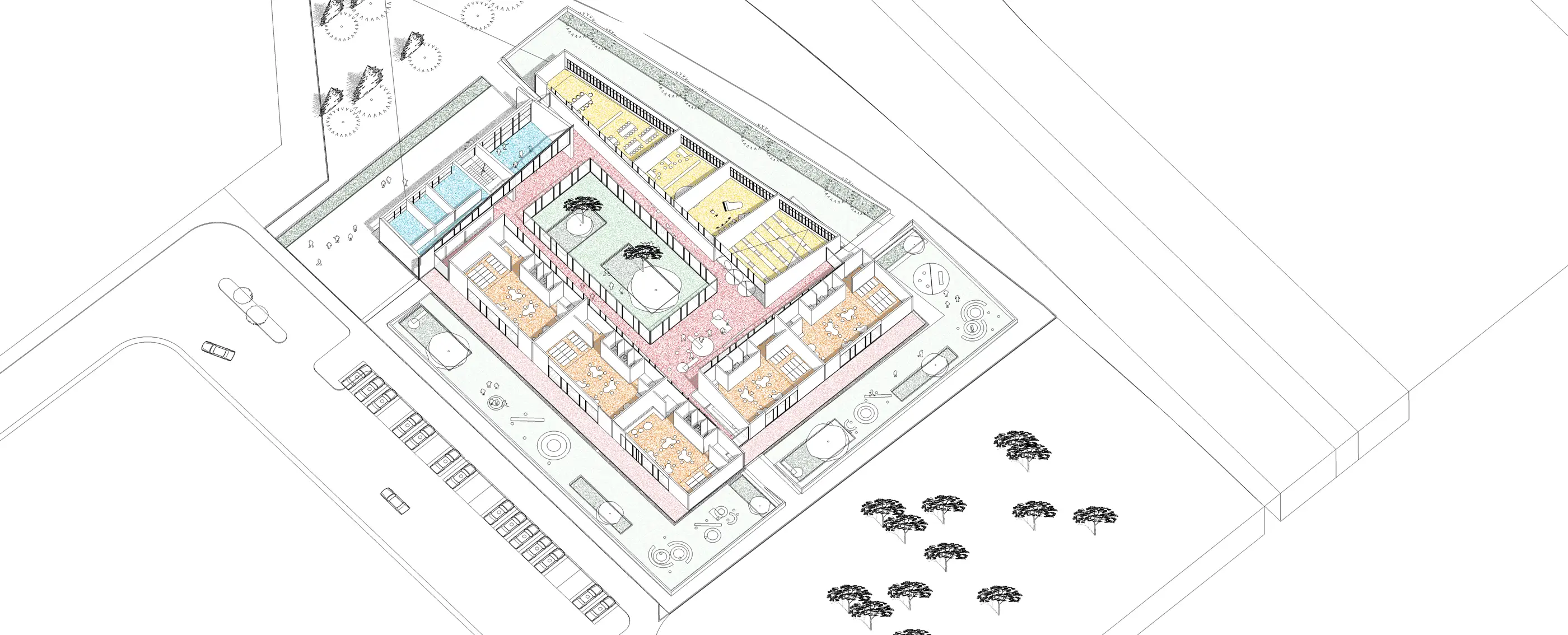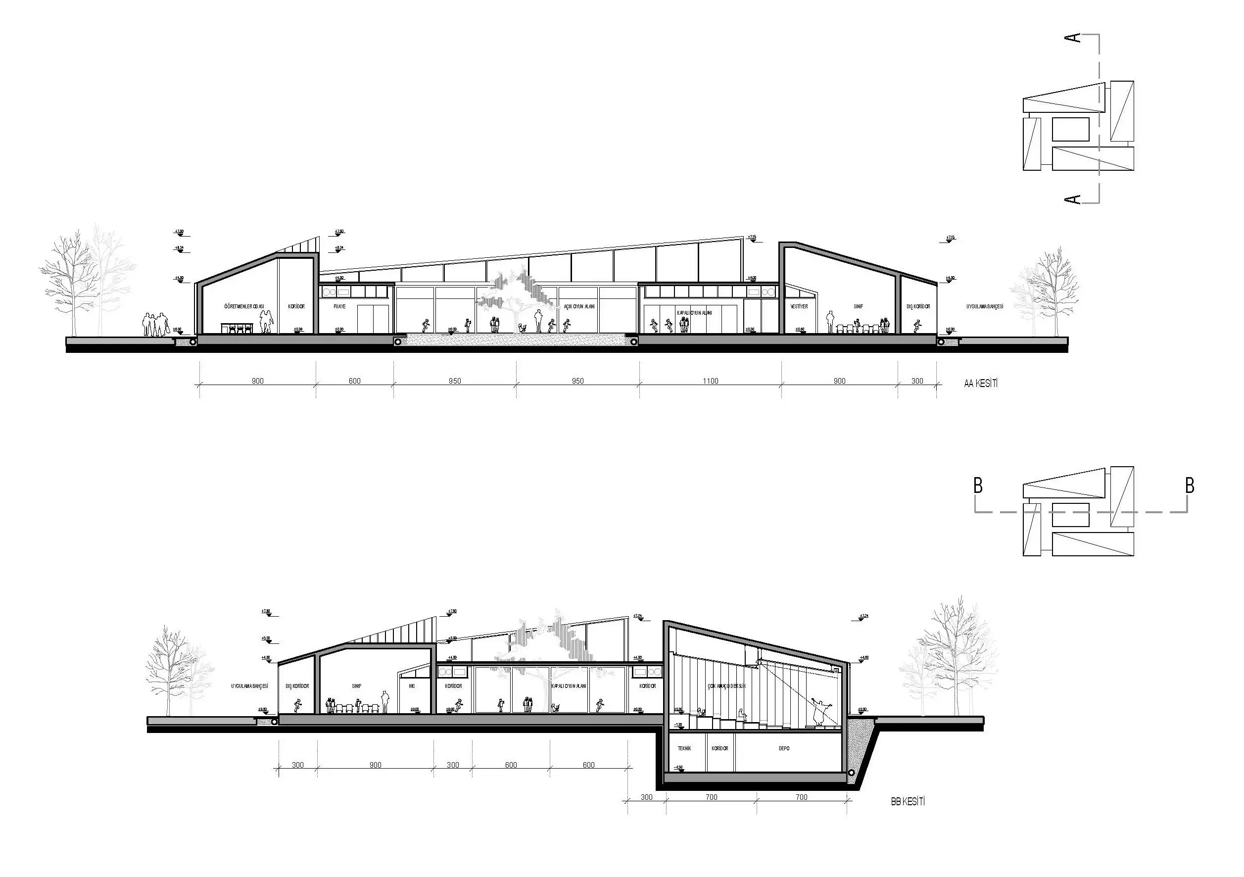 Eğitimin sadece kapalı sınıf alanında değil açık alanlarla da bağlantılı olduğu bu tipolojiyle kentin Selçuklu Dönemi Mimarisi belleğiyle de bağ kurmak amaçlanmıştır. Parselin yapılaşma sınırına kadar yayılan tek katlı yapı, anaokulu programı doğrultusunda yönetim kütlesi, sınıf kütleleri ve sosyal kütle olarak dört ayrı kütleye parçalanmıştır. Bu kütleler girişle ve avluyla bağlantı kuran sirkülasyon alanlarıyla birbirine bağlanmıştır.