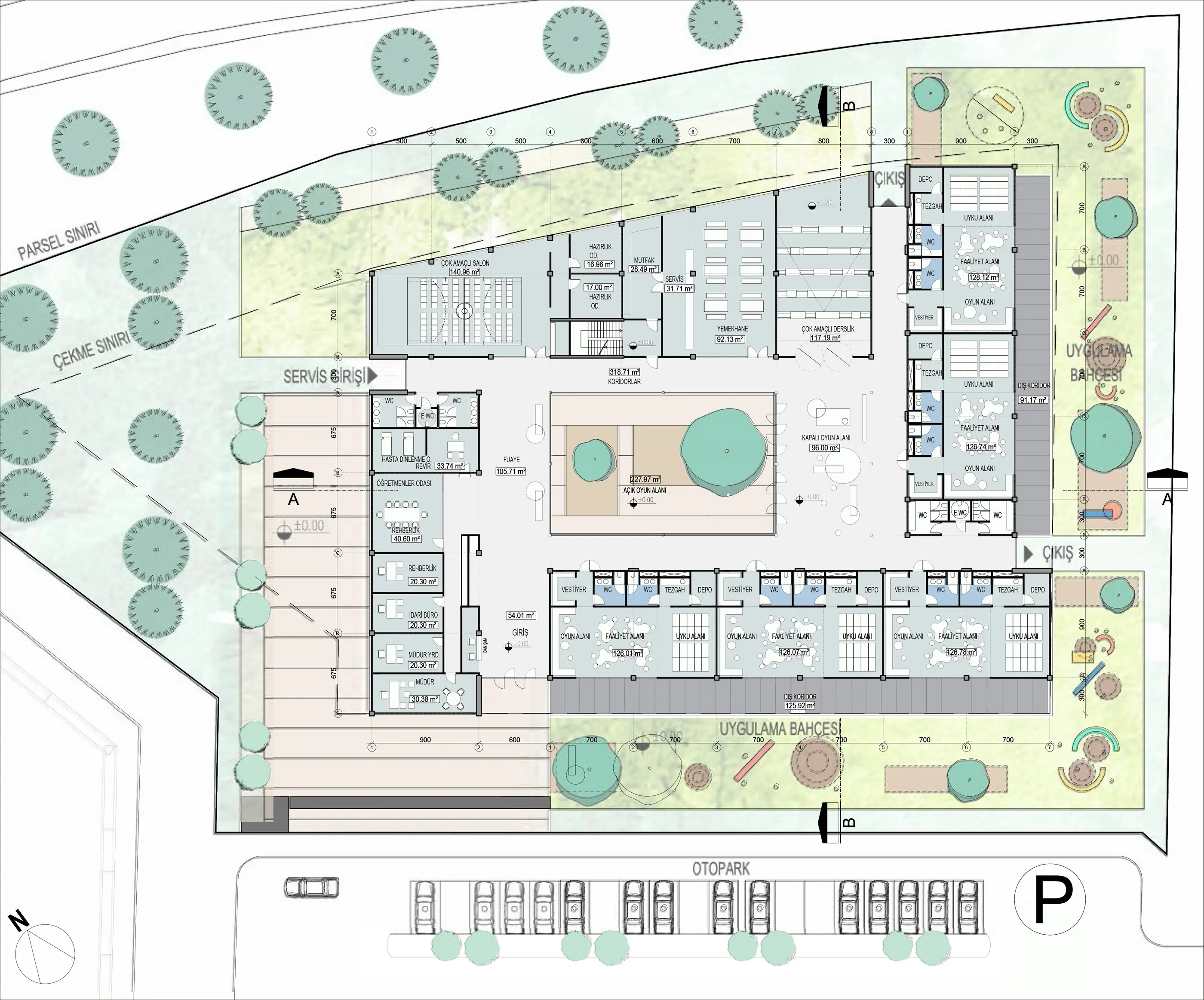 Konya Organize Sanayi içinde ve çevreyolu kenarında konumlanan anaokulu projesinde çocukların daha korunaklı, içe dönük bir eğitim almalarını sağlamak amacıyla avlulu yapı tipolojisi referans alınmıştır.