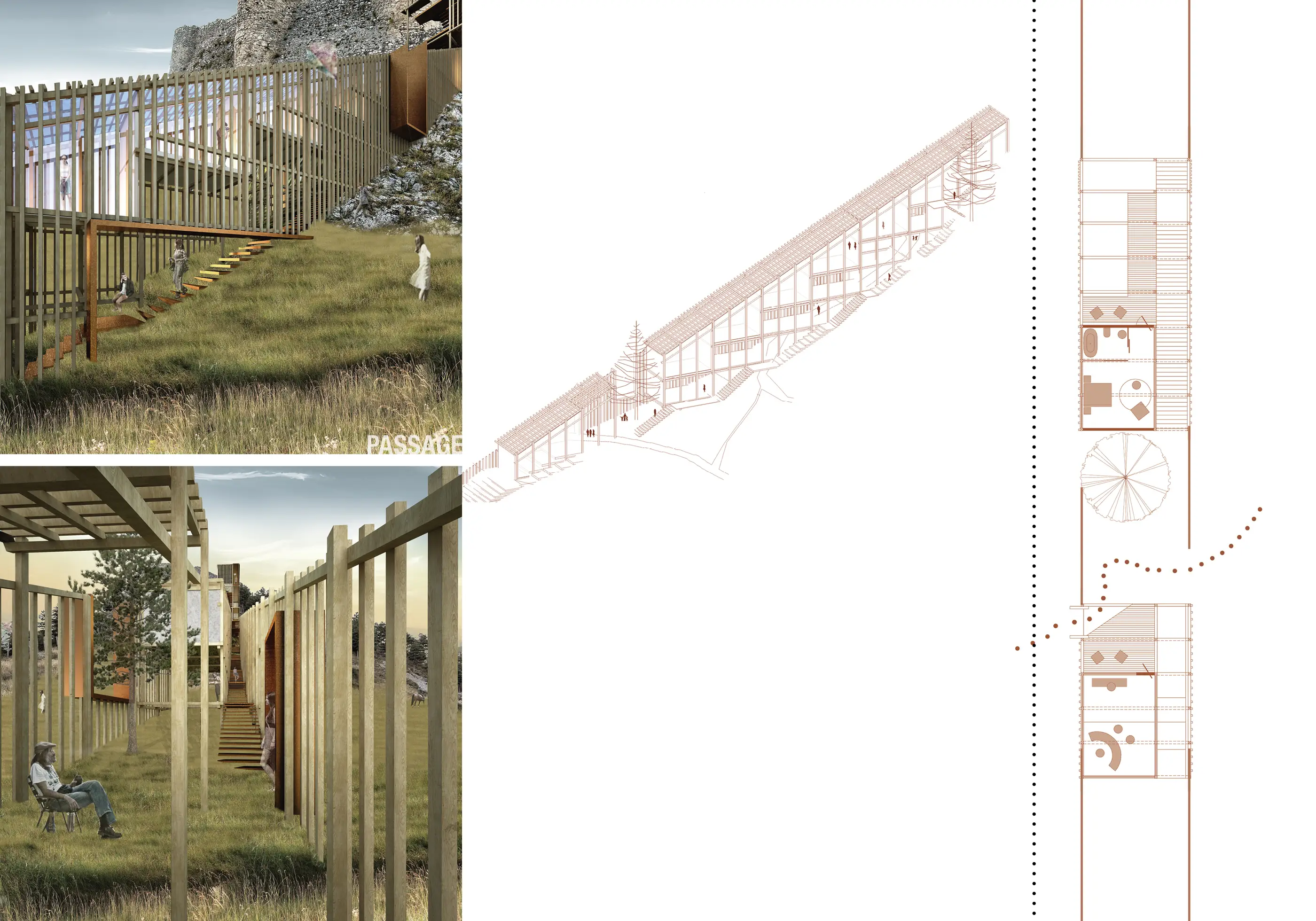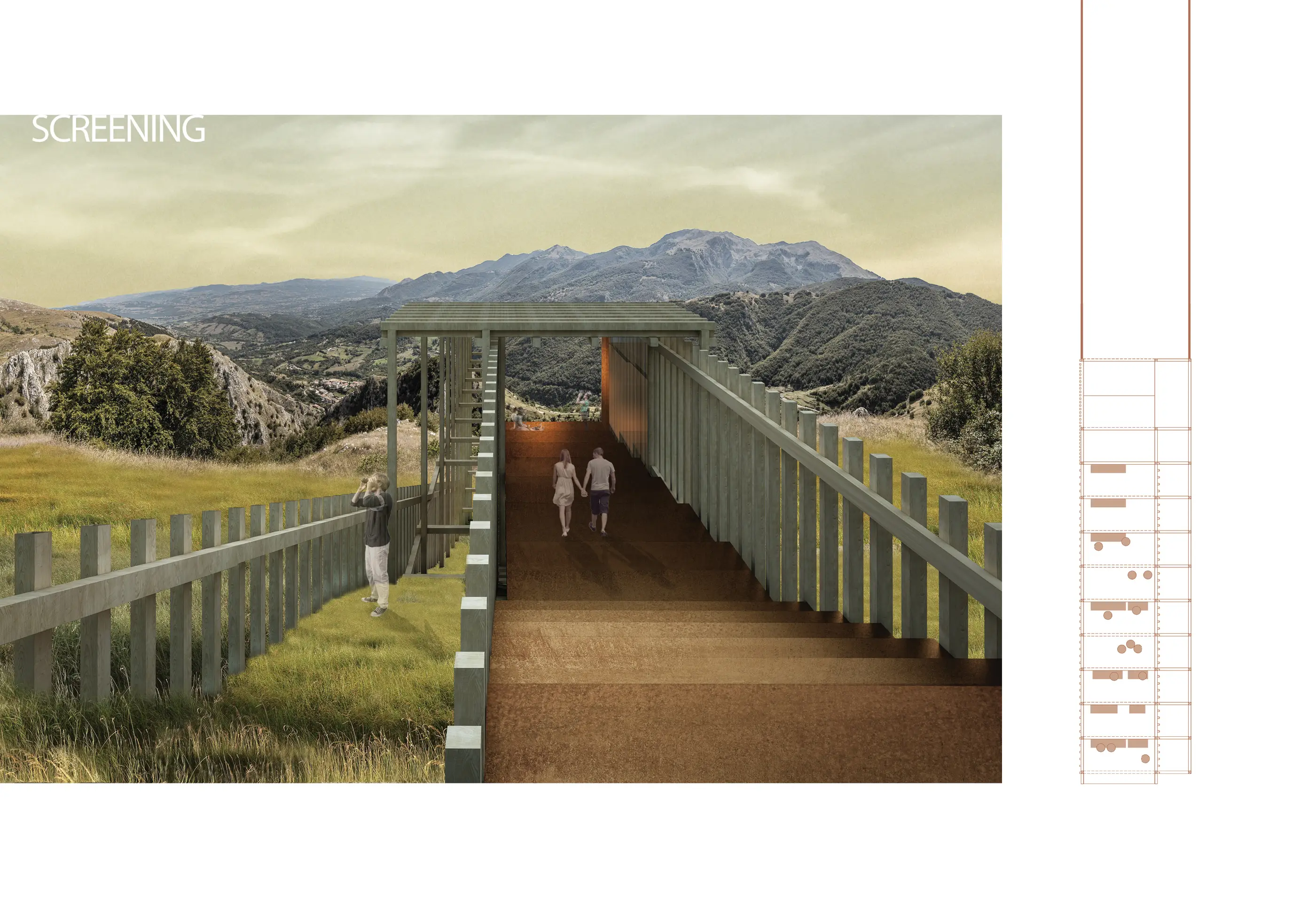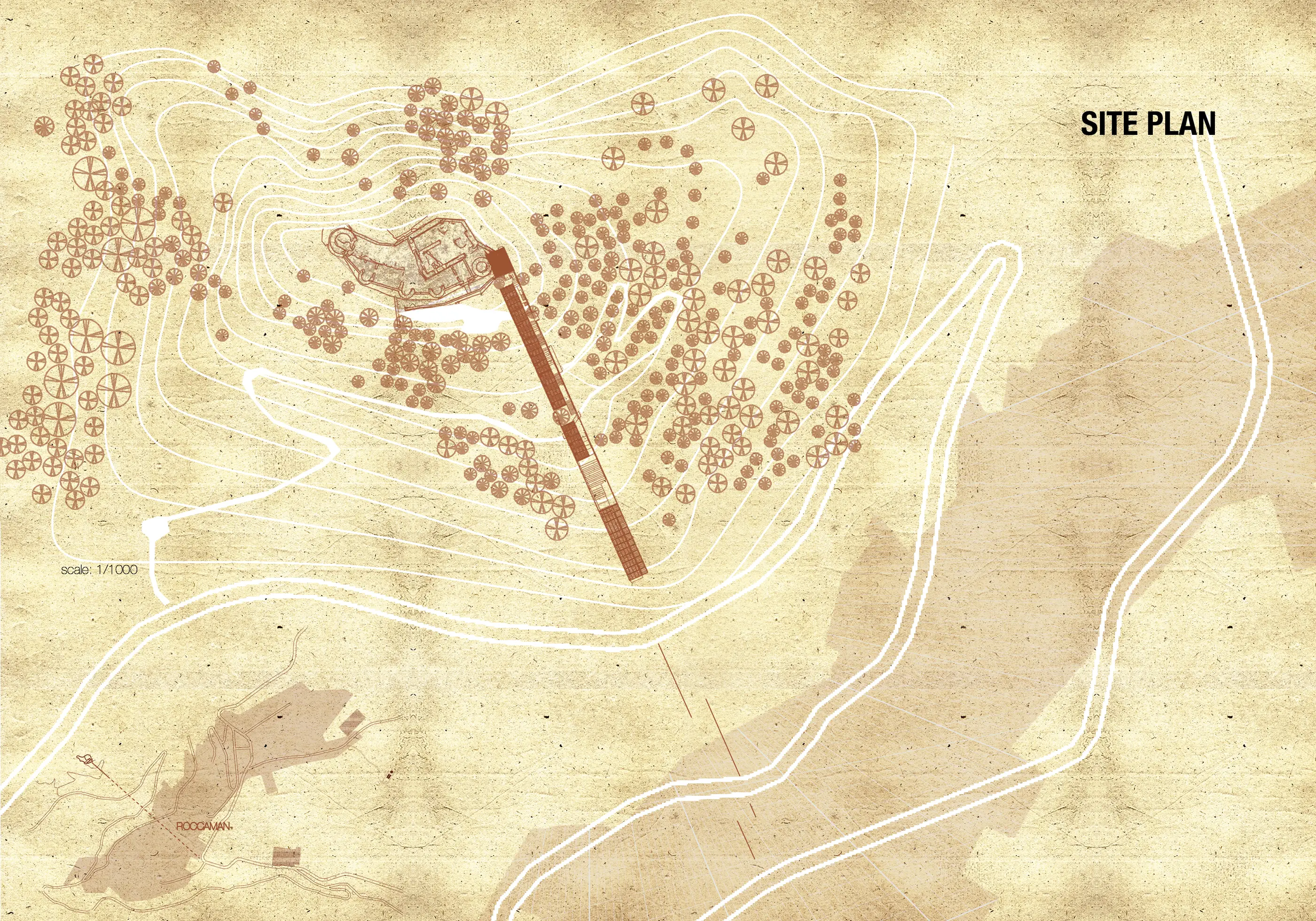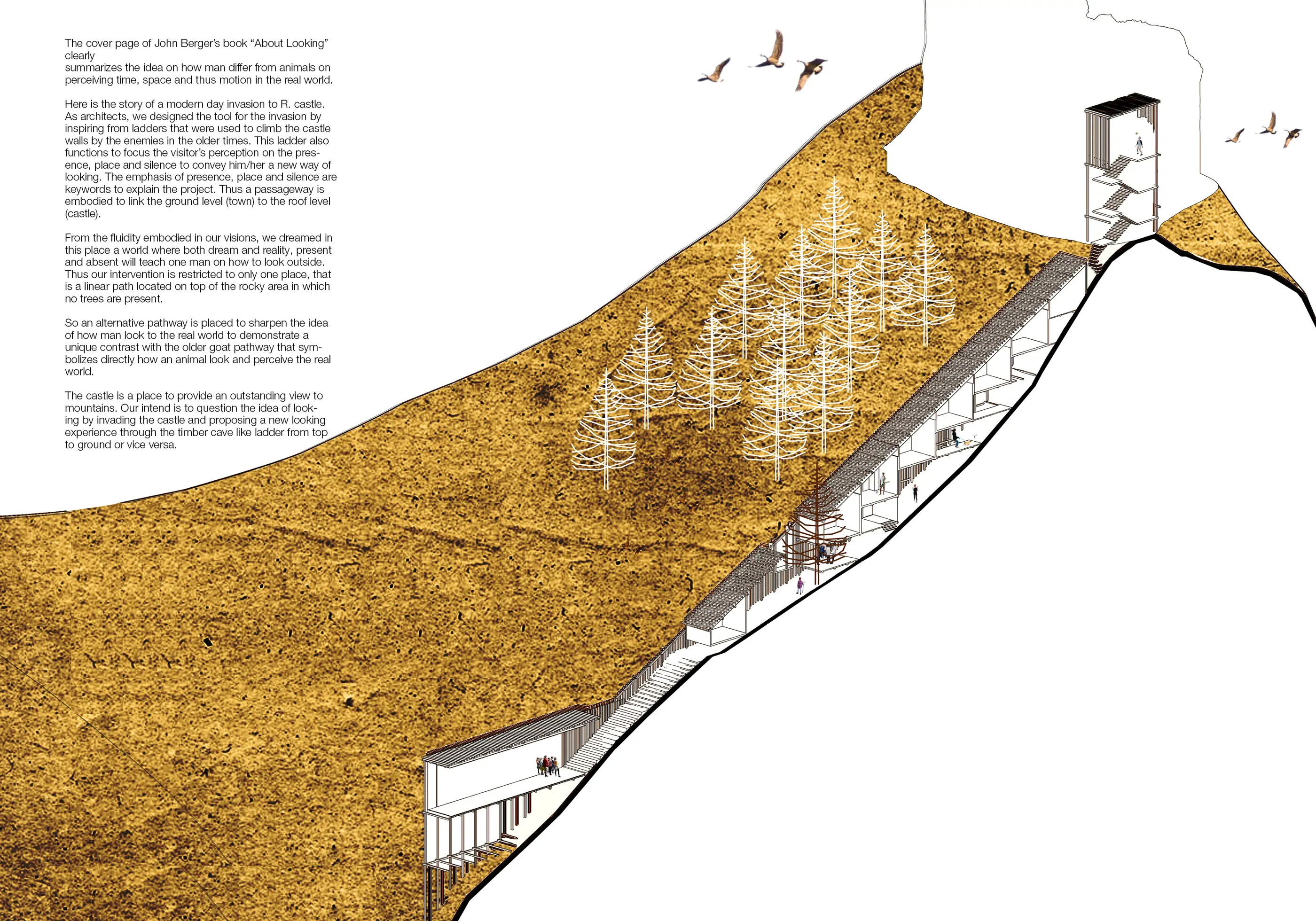 Kale, dağlara doğru etkileyici bir manzara sunan bir noktada yer almaktadır. Amacımız, kaleyi “istila ederek” bakma fikrini sorgulamak ve üst kot ile zemin kotu arasında — ya da ters yönde — işleyen, ahşap ve mağara benzeri bir merdiven aracılığıyla yeni bir bakış deneyimi önermektir.
