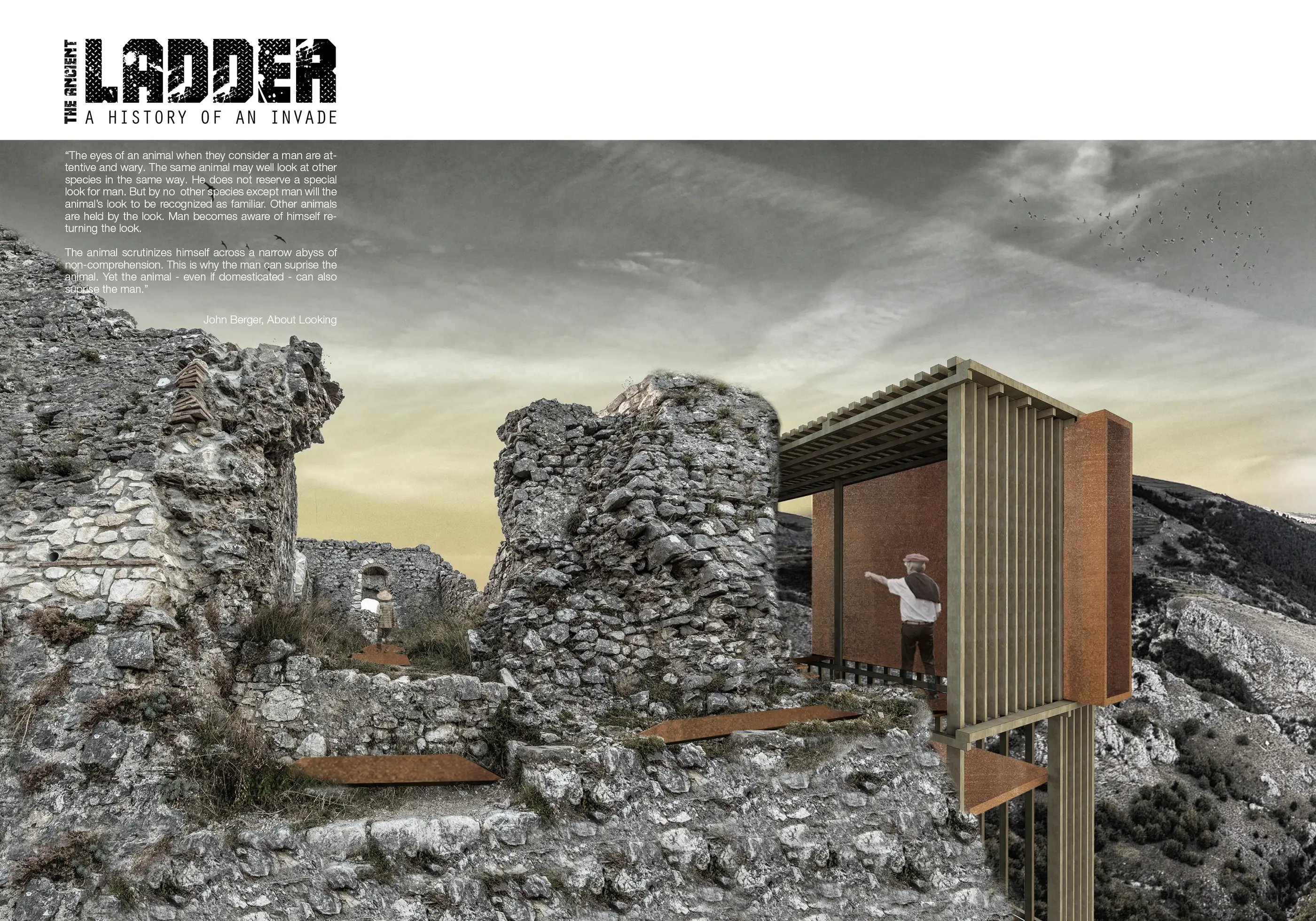 Mimarlar olarak, geçmişte düşmanların kale duvarlarına tırmanmak için kullandıkları merdivenlerden ilham alarak bu istilanın aracını tasarladık. Bu merdiven aynı zamanda ziyaretçinin algısını varlık, yer ve sessizlik üzerine odaklayan bir araç olarak çalışır ve ona yeni bir bakış biçimi sunar.