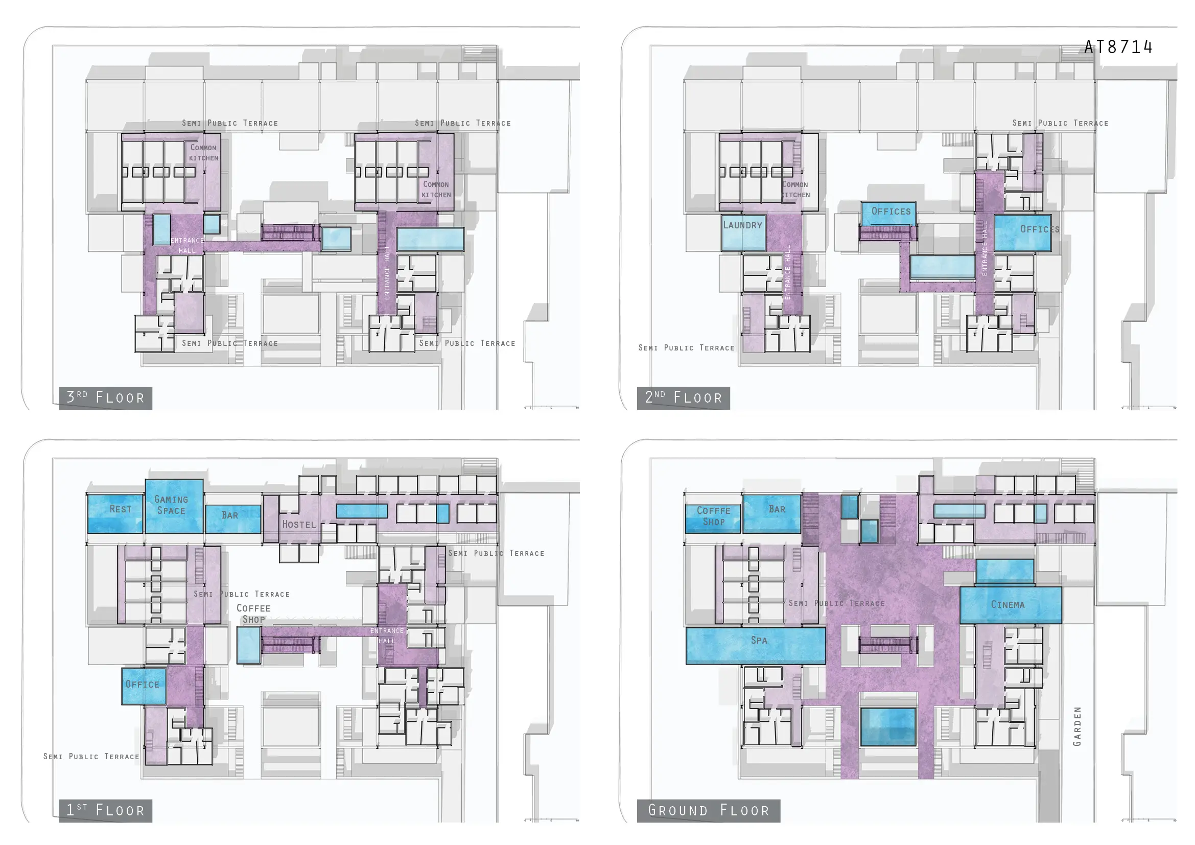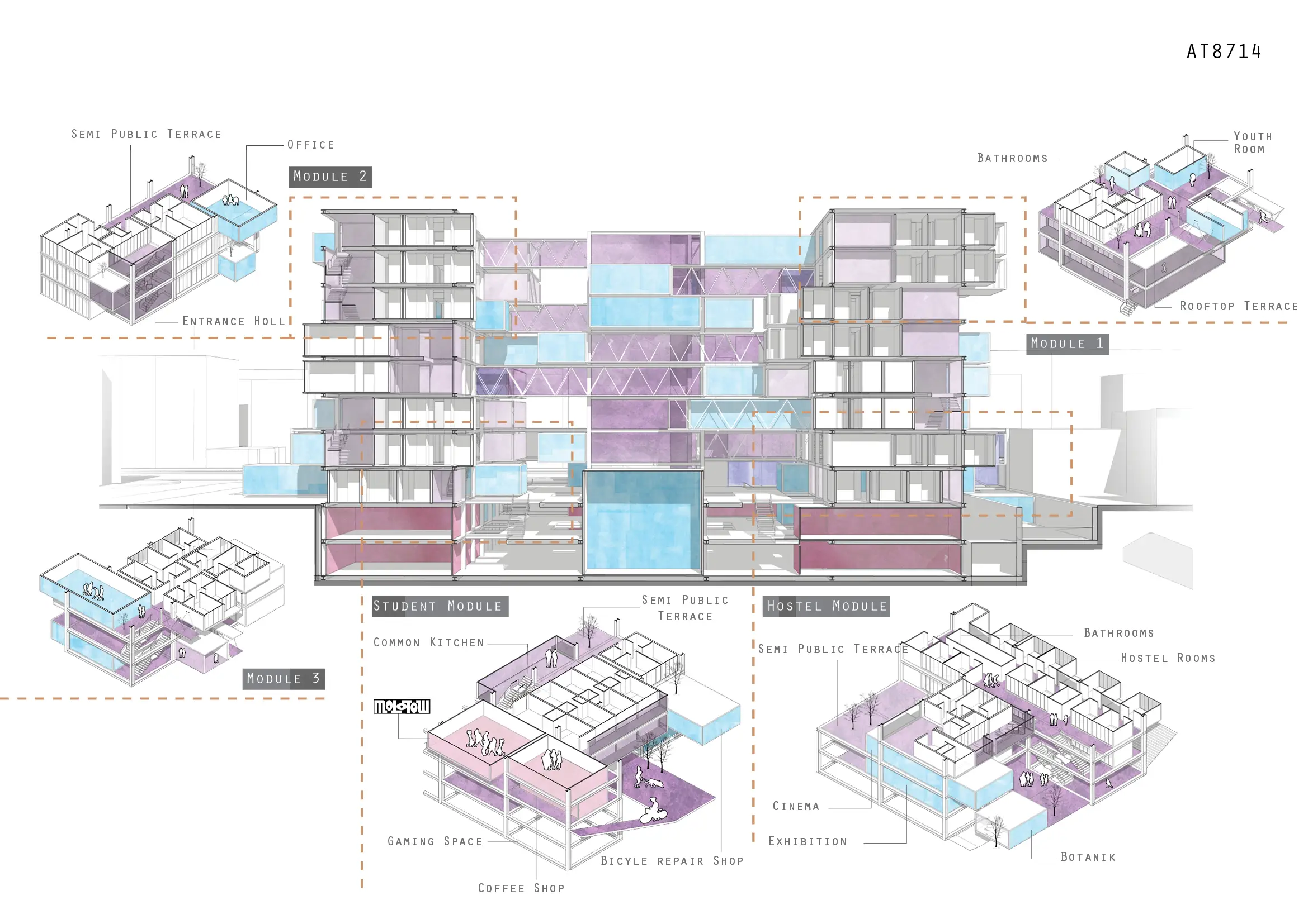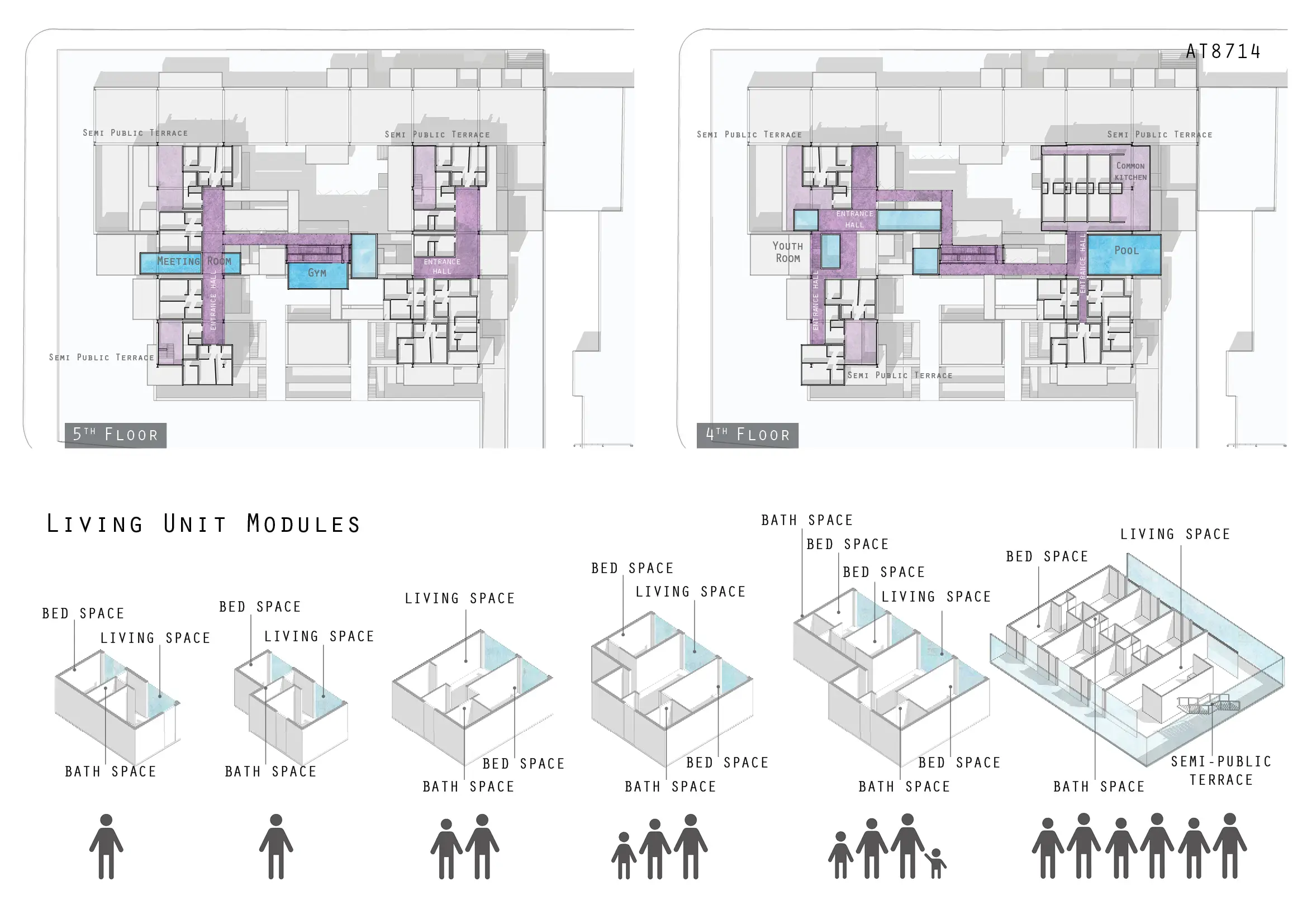 Sekiz katlı konut blokları farklı hane tiplerine uyum sağlayan modüler bir sistemle kurgulanmıştır. Düşey dolaşım boyunca yer alan yarı özel ortak alanlar, kullanıcılar arasında etkileşim kuran sosyal mekânlar oluşturur.
