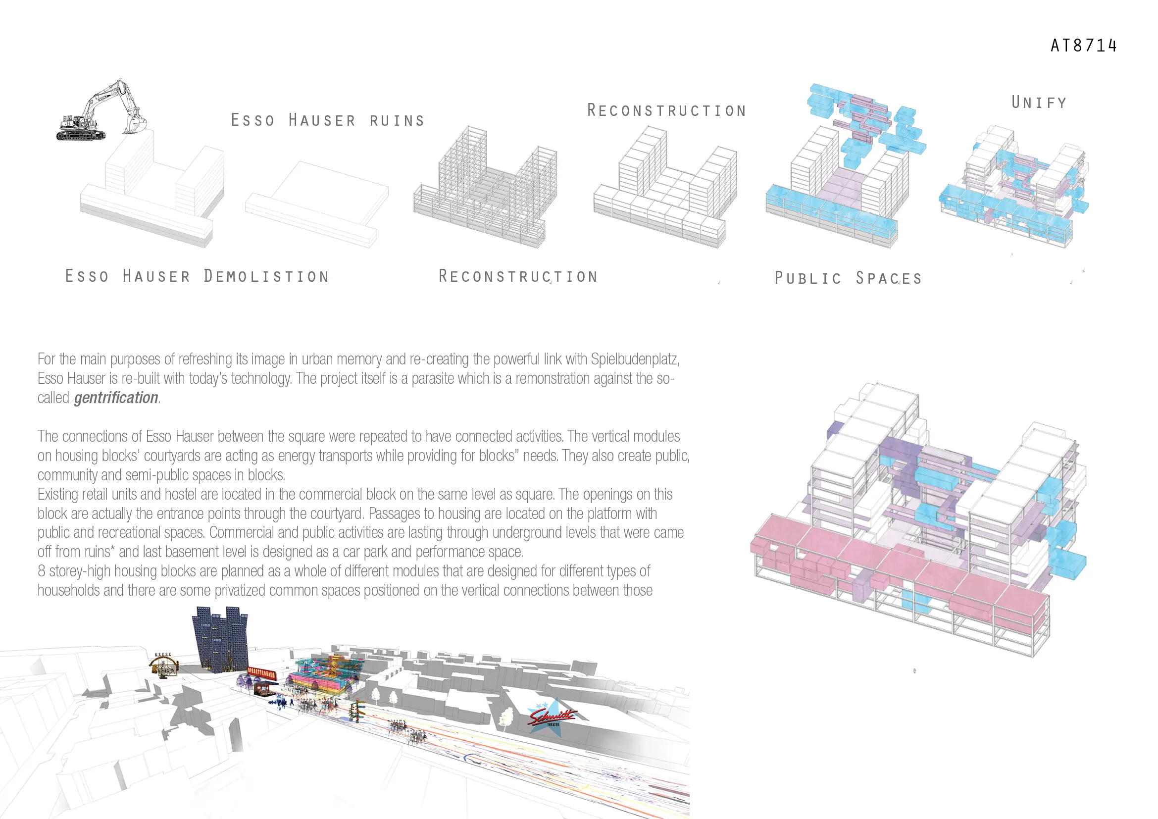 Proje, bu sürece eleştirel bir mimari yaklaşım önerir. Esso Häuser güncel teknolojilerle yeniden yorumlanırken Spielbudenplatz ile olan ilişkisi ve kentsel hafızadaki yeri korunur. “Parazitik” bir yapı kurgusu olarak tasarlanan öneri, soylulaştırma süreçlerine karşı bir karşı duruş niteliği taşır.