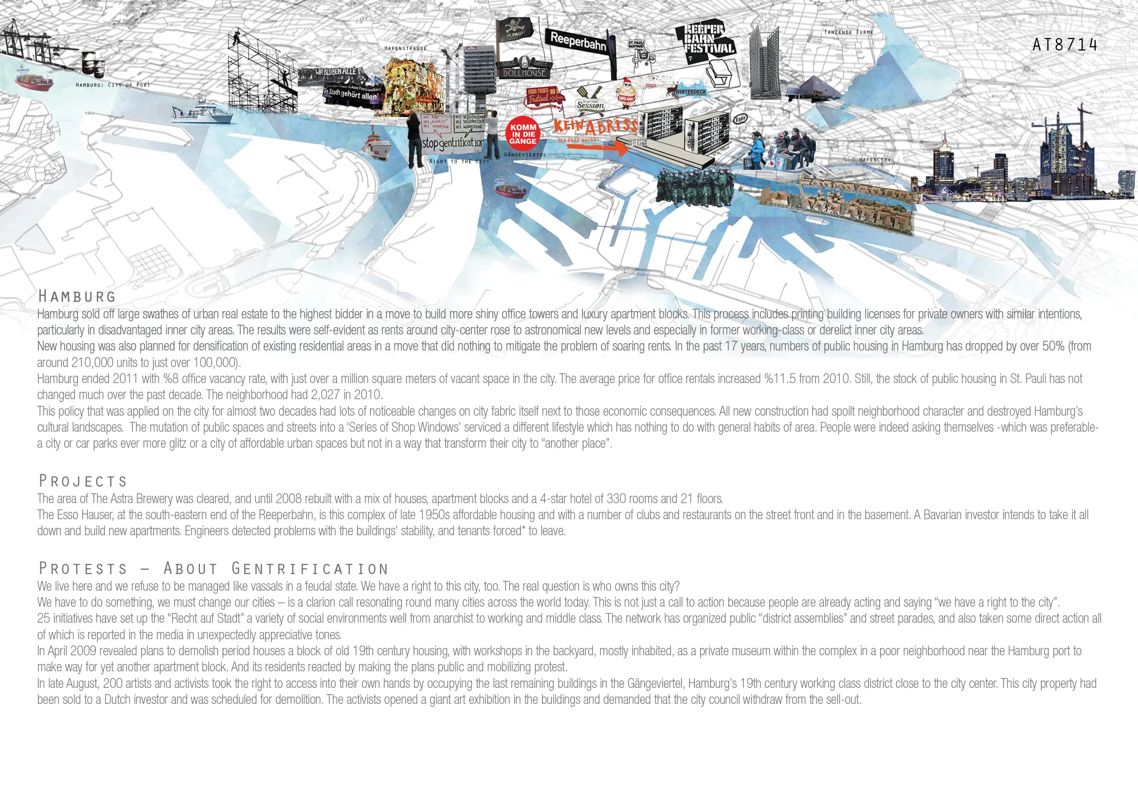 Bu dönüşümün en belirgin örneklerinden biri Reeperbahn yakınındaki Esso Häuser kompleksidir. 1950’lerin sonunda uygun fiyatlı konut olarak inşa edilen ve zemin katında kulüp ve restoranların bulunduğu bu yapı, özel bir yatırımcı tarafından yıkılarak yeniden geliştirilmek üzere planlanmıştır. Yapılarda tespit edilen taşıyıcı sistem sorunları nedeniyle kiracılar binaları terk etmek zorunda kalmış ve bu durum kentte soylulaştırma karşıtı protestoları tetiklemiştir.
